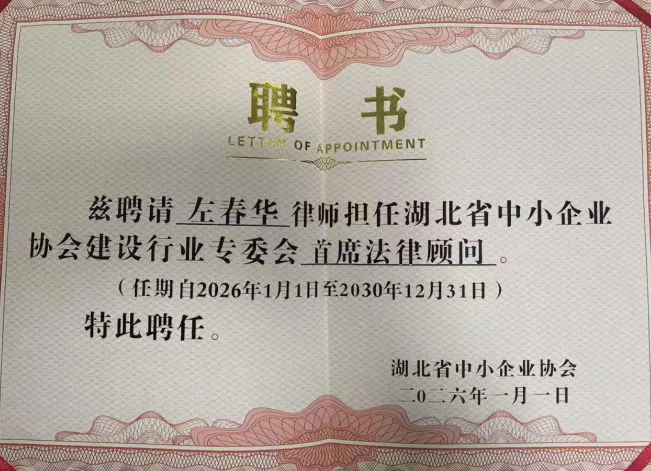 在1月30日下午举行的湖北省中小企业协会年会上,协会正式聘任左春华律师为建设行业专委会首席法律顾问。聘书由协会执行会长、建设行业专委会主任黄进军现场颁发。