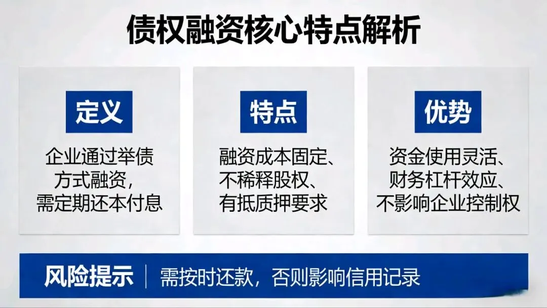 说白了就是“借钱”。适合现金流稳定、有抵押或担保,又不想稀释股权的企业,短期周转用它最稳妥。银行经营贷、抵押贷、供应链金融、债券等都是常见形式,成本可控、流程成熟,关键是不丢公司控制权。但老何要提醒,债权融资的核心风险是“刚性兑付”,不管企业盈亏,到期必须还本付息,一旦资金链断裂,违约、诉讼甚至资产被处置的风险就会找上门,务必算好偿债能力。
