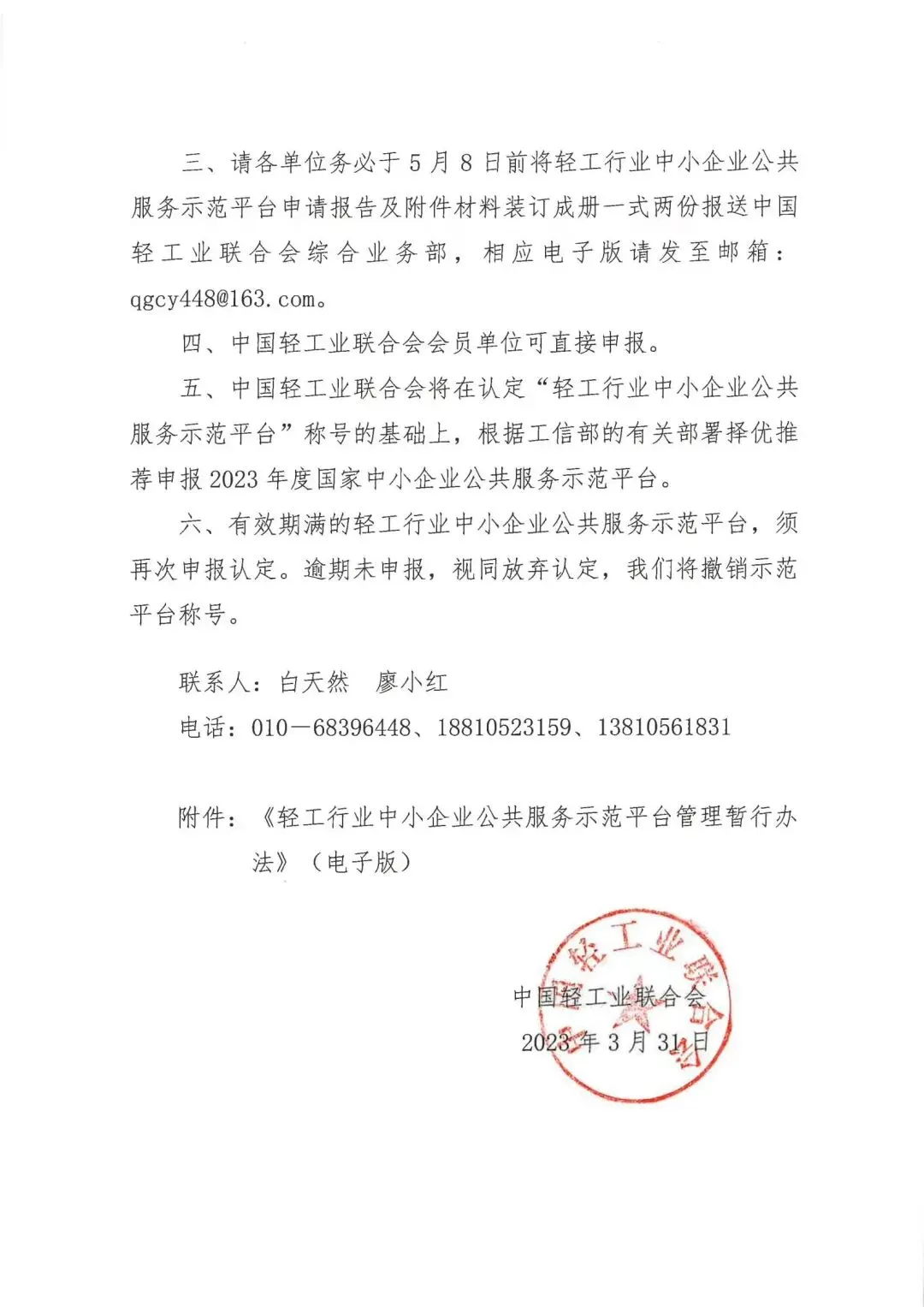为贯彻落实中办、国办印发的《关于促进中小企业健康发展的指导意见》,推动照明行业中小企业服务平台建设,根据中国轻工业联合会《关于组织开展2023年度轻工行业中小企业公共服务示范平台认定工作的通知》的要求,我协会将负责照明行业中小企业公共服务示范平台申报的组织和推荐工作,请相关单位按照要求,做好申报工作,并于5月4日前将纸质版材料一式三份和电子版一并报送协会。(相关文件可点击下方“阅读原文”下载)