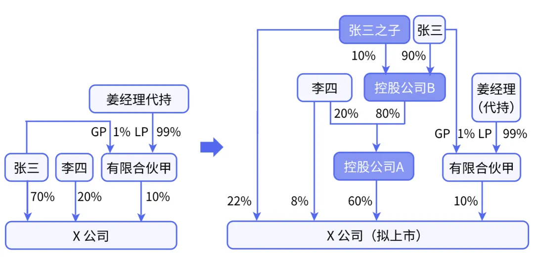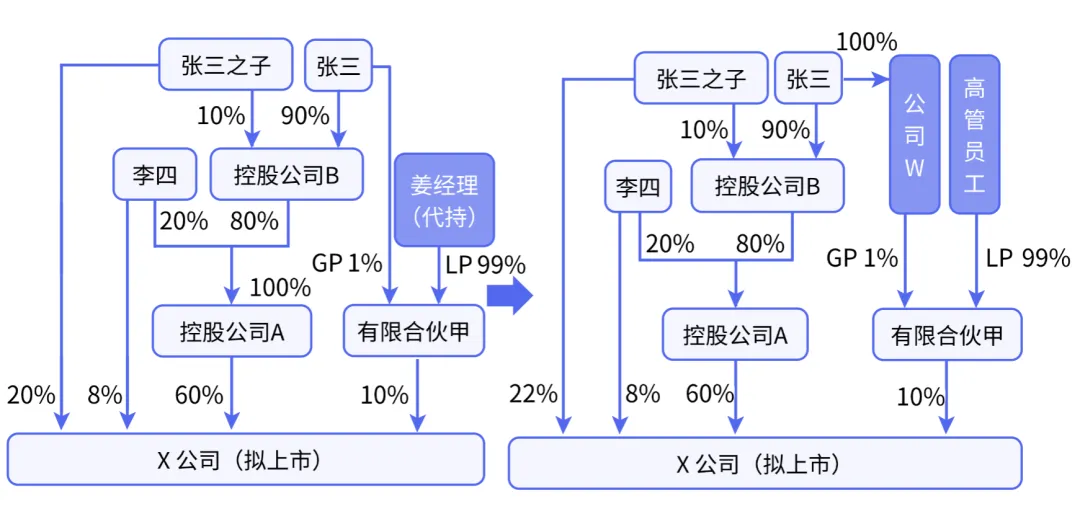 姜经理为代持合伙企业份额(其认缴合伙企业份额的资金来源于张三赠与),待公司实施股权激励时,将其代持份额过户给激励对象。