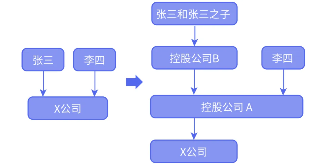 第一步:张三家族(指张三和张三之子)设立控股公司B。