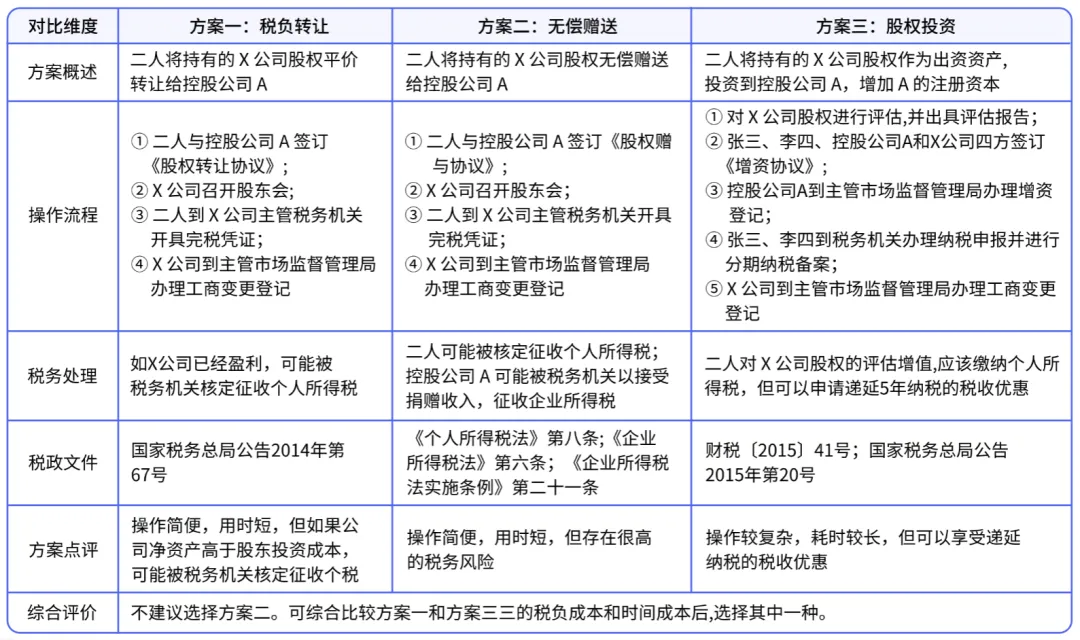 个人持股架构变为公司持股架构有3种路径:股权转让、无偿赠送、股权投资。表1为3种路径的比较。
