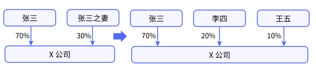 李四和王五以每注册资本1元的价格受让了张三妻子持有的股权,张三妻子退出公司。该阶段股权架构变化如图2所示。
