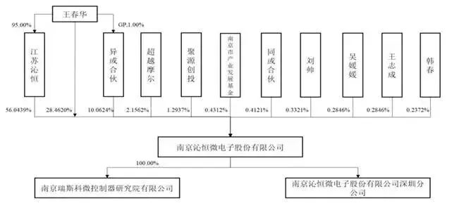 招股书显示,沁恒微的控股股东为江苏沁恒,实际控制人为王春华。其中,江苏沁恒直接持有公司56.04%的股份,为公司单一第一大股东;公司实控人王春华直接持有公司28.46%股份,并通过江苏沁恒、异或合伙分别控制公司56.04%、10.06%的股份,合计控制公司94.57%股份,控制权高度集中。