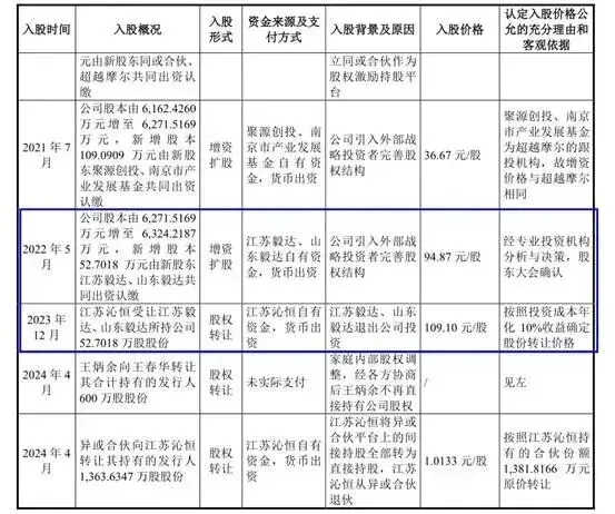 2023年12月,江苏毅达、山东毅达与江苏沁恒签署了《股份转让协议》,协议约定江苏毅达、山东毅达向江苏沁恒转让其合计持有的发行人52.7018万股股份,股份转让价格为109.1元/股,折合投资人年化收益率10%,转让价款为5750万元,折合公司估值69亿元。