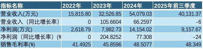 恒运昌的业绩呈现爆发式增长。2022年至2024年,公司营业收入从1.58亿元飙升至5.41亿元,年均复合增长率高达84.91%;归母净利润从2618.79万元增长至1.42亿元,增幅超过440%。仅2024年,营收与净利润便分别实现66.26%和77.31% 的同比增长,增长势头迅猛。