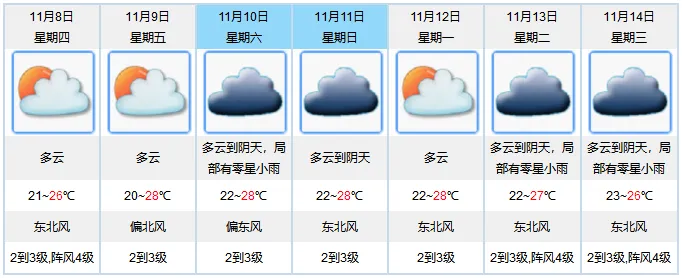今天多云,气温介于21到26度。早晚清凉,午间舒适,请注意适时添衣。预计,未来一周多云为主,间中有弱冷空气渗透,但气温平稳。午间温暖,早晚稍凉,部分时段有轻雾或雾,能见度较低,出行需注意交通安全。