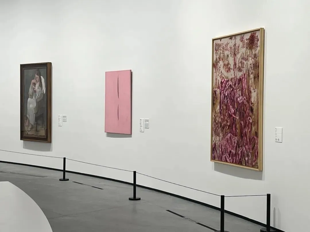 作为粉色单元的第一件作品,蔡锦1998年创作的《美人蕉146》旁边是一张粉色的卢齐欧·丰塔纳作品《空间概念,期待(T. 104)》。策展人这样的有意为之,形成了独特的对立统一。