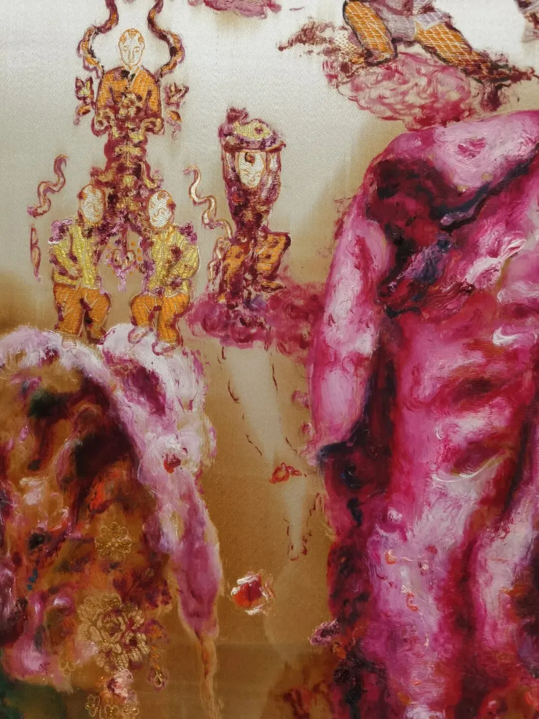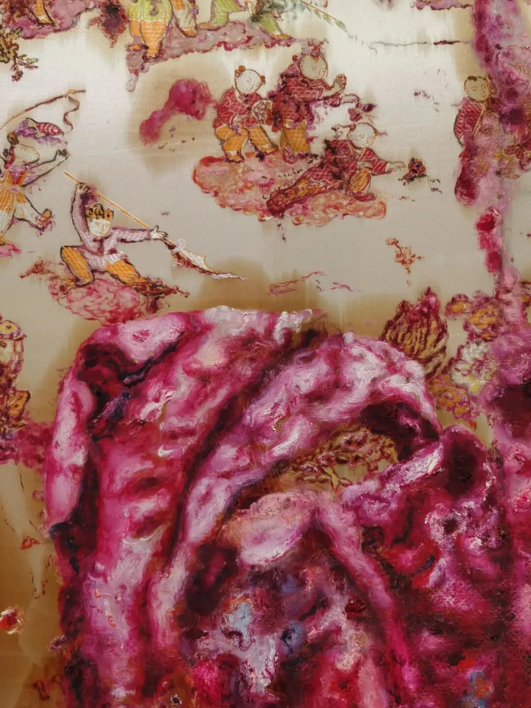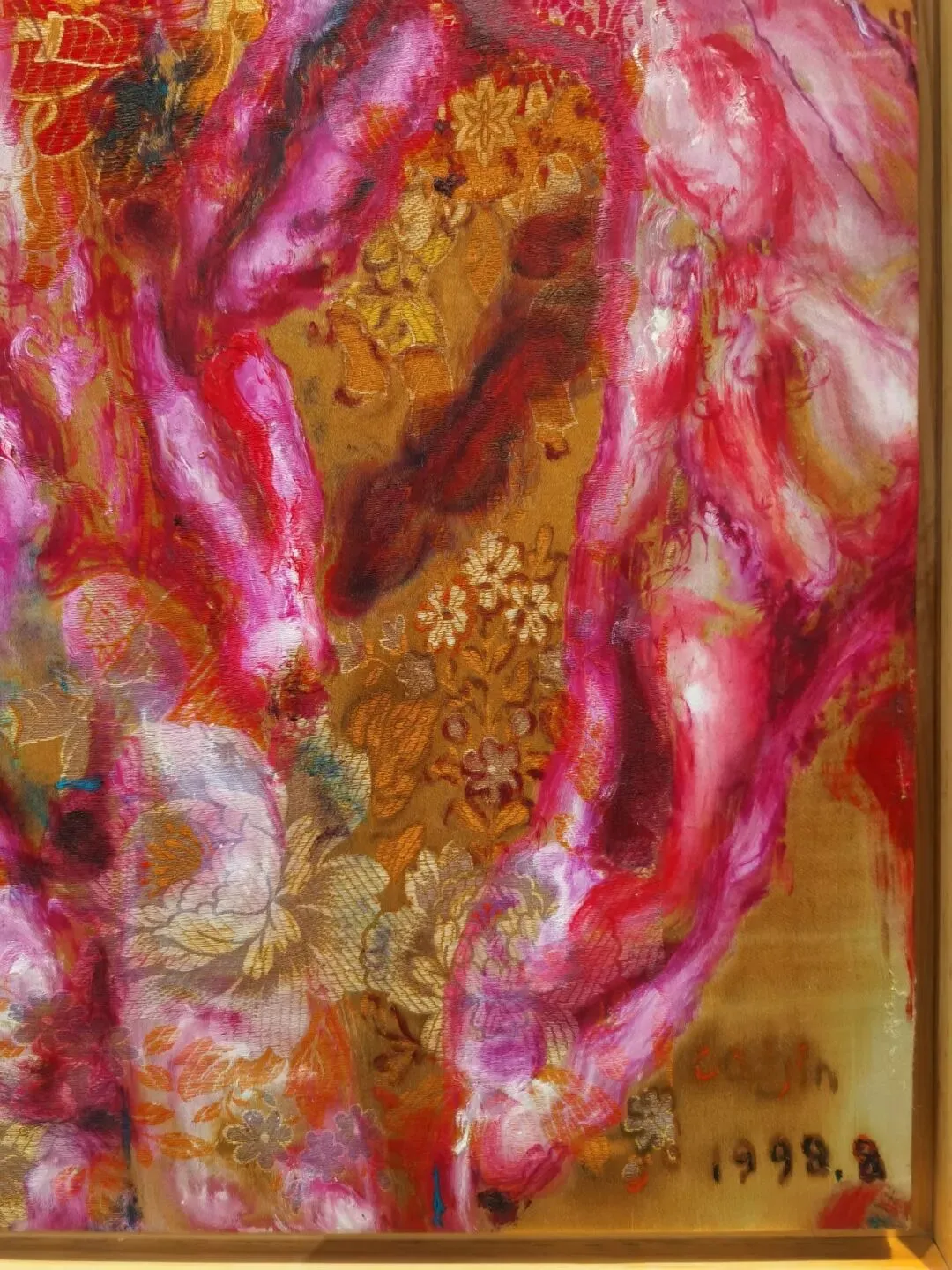 《美人蕉146》的画布选用温润的中国丝绸,艺术家特意从国内带到纽约的百子图绣纹细密排布,在粉色与红色的笔触交织下若隐若现,仿佛东方文化的基因密码在西方创作语境中悄然生长。丝绸特有的柔滑光泽与堆叠的颜料形成鲜明反差,厚重的笔触层层缠绕、蔓延,如同细胞裂变般充满生命张力。