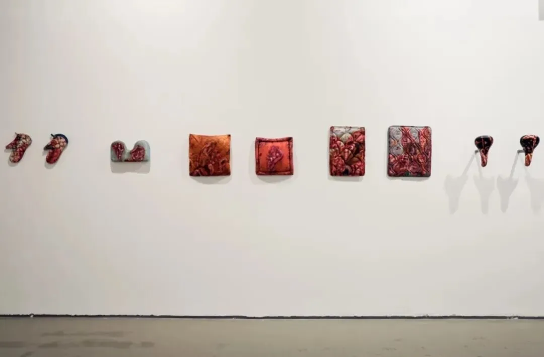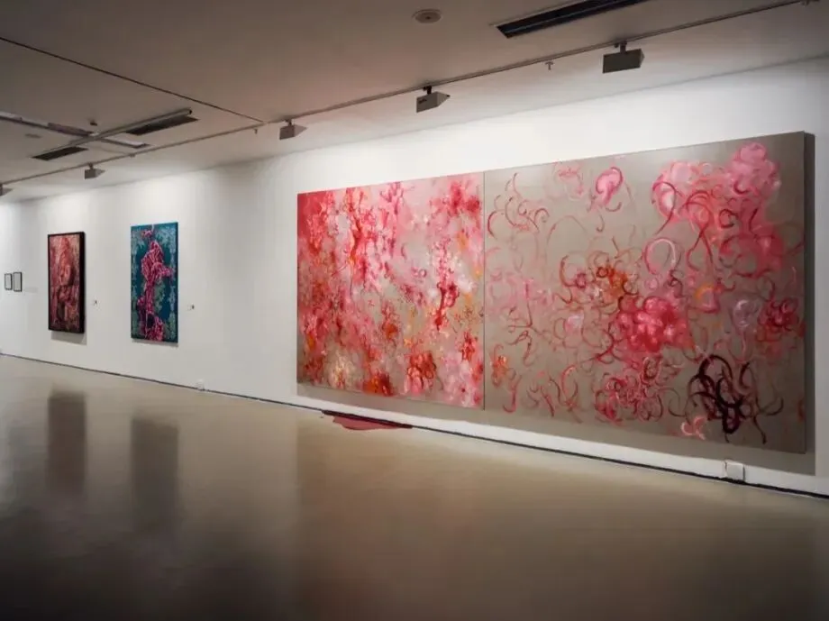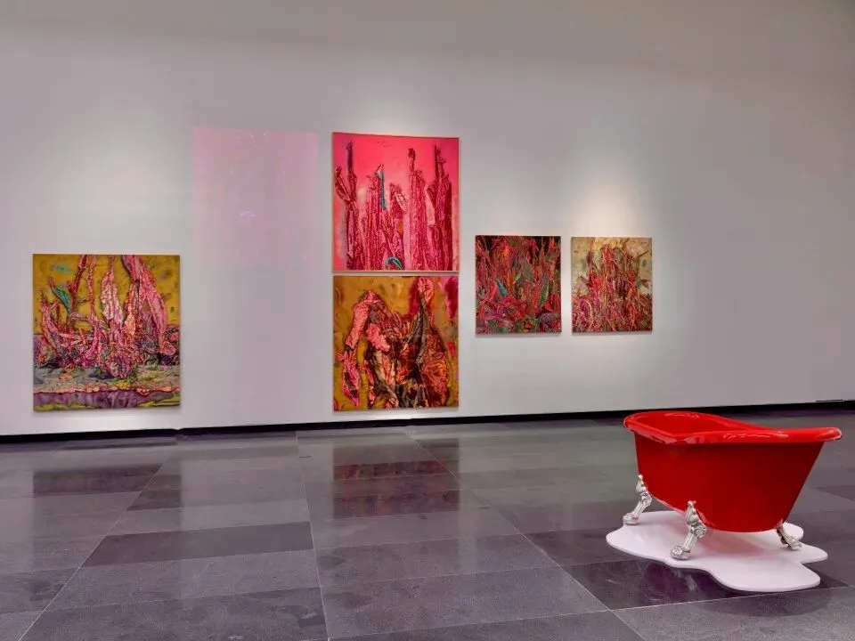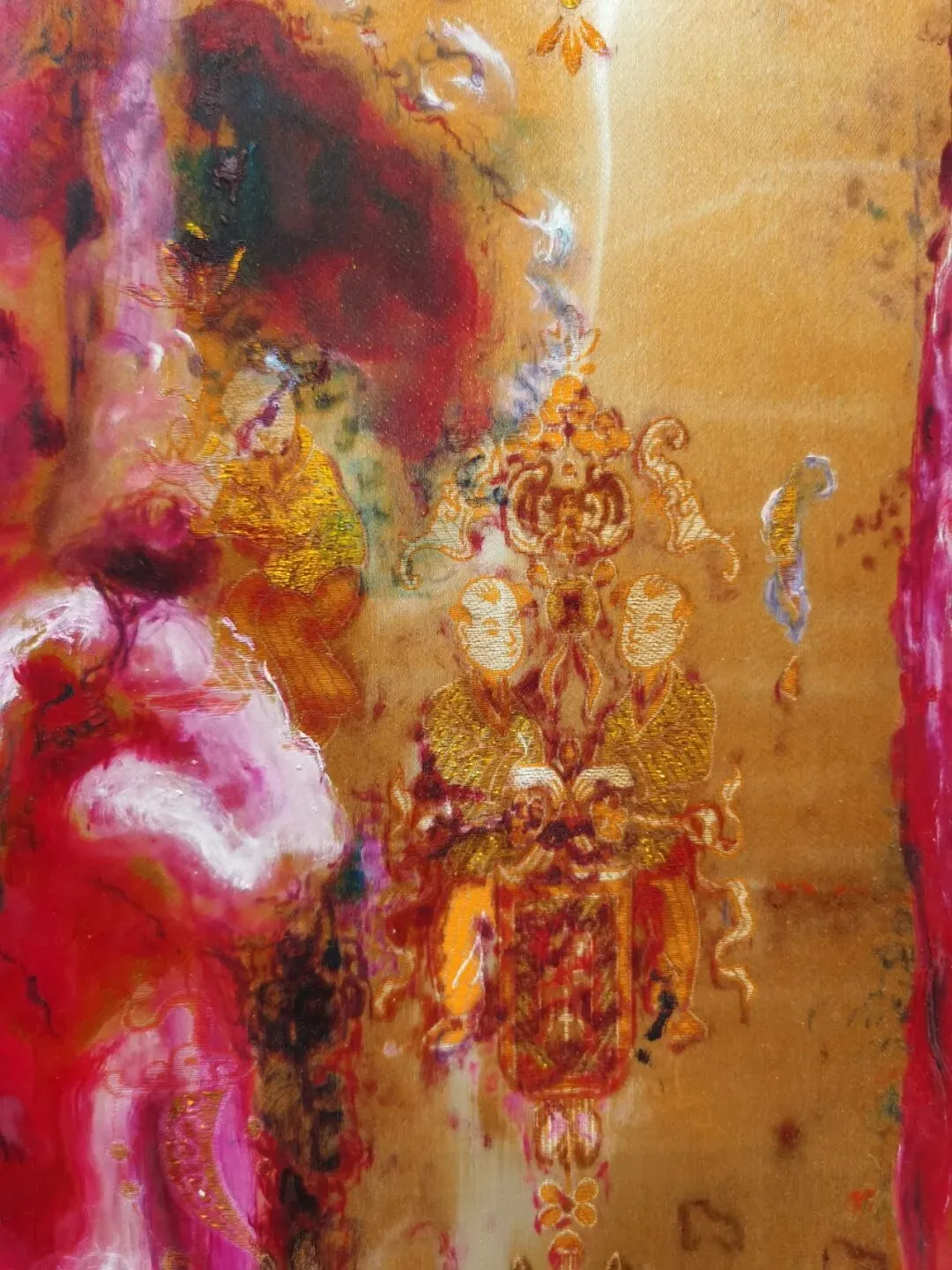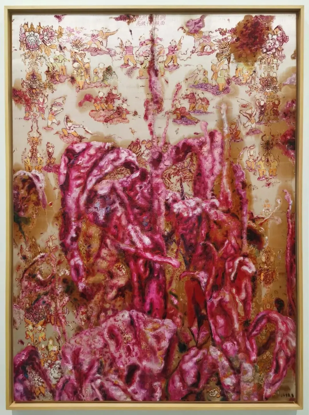 《美人蕉146》的画布选用温润的中国丝绸,艺术家特意从国内带到纽约的百子图绣纹细密排布,在粉色与红色的笔触交织下若隐若现,仿佛东方文化的基因密码在西方创作语境中悄然生长。丝绸特有的柔滑光泽与堆叠的颜料形成鲜明反差,厚重的笔触层层缠绕、蔓延,如同细胞裂变般充满生命张力。