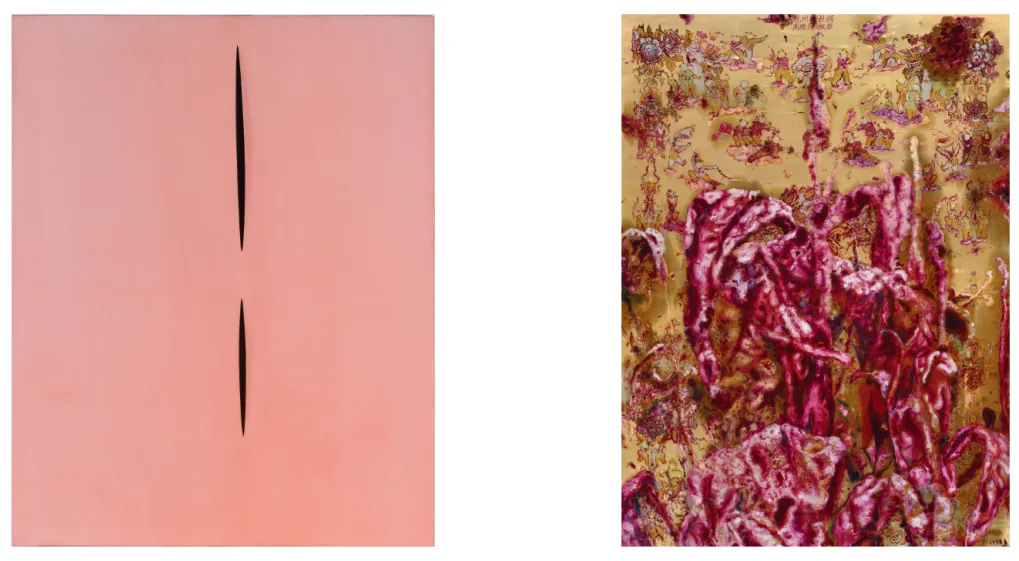 丰塔纳的作品以极简的切割打破二维画布的桎梏,锋利的切口在粉色画布上划出“虚空”,将物理空间引入绘画,以否定性的姿态重构艺术与空间的关系。
