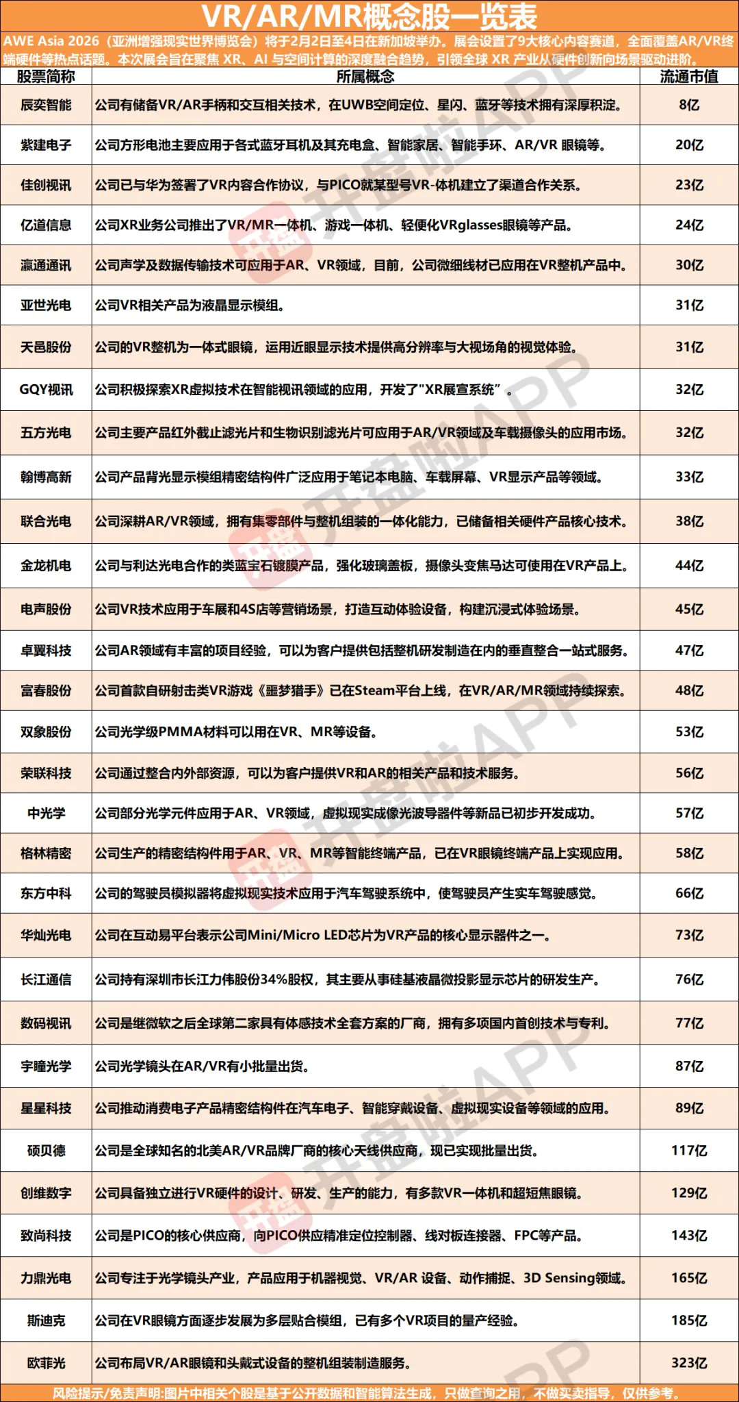 两市最全“VR/AR/MR概念股”一览表如下: