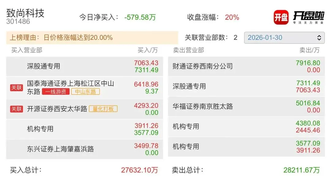 从盘后龙虎榜来看,深股通专用买入7063万元,国泰海通证券上海松江区中山东路买入6418万元。该股属于通信概念,总市值达255亿,具备一定的容量辨识度。同时板块为周五强势发酵的方向之一,涨停数为全市最多,且有千亿市值天孚通信大涨创下历史新高,资金介入程度较深。在通信板块维持强势且市场量能充沛的情况下,可观察其能否继续吸引场外资金进场。