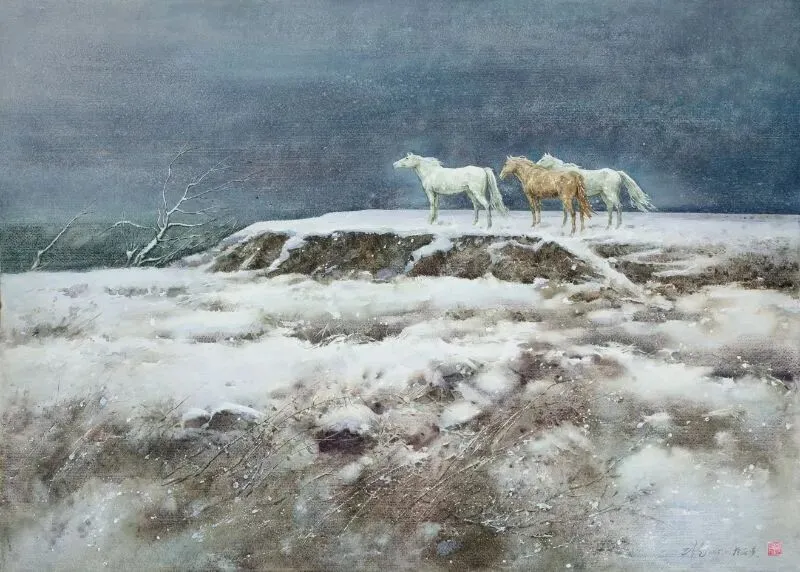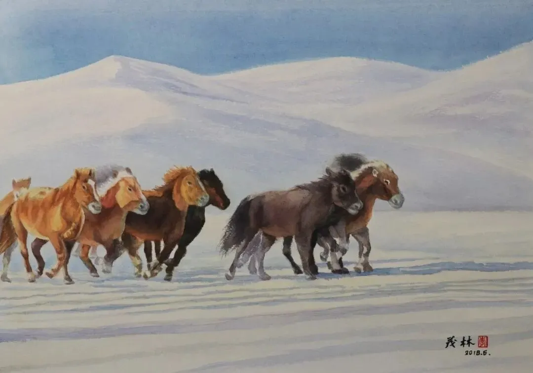 《《雪地奔驰》水彩52x36cm