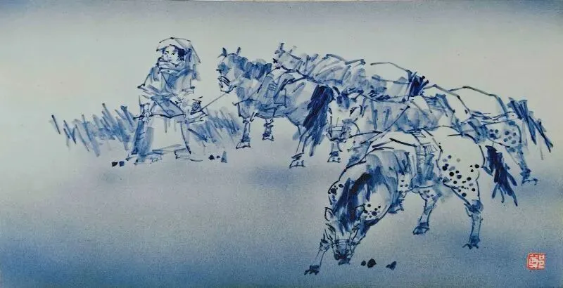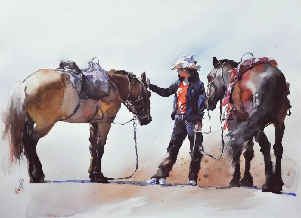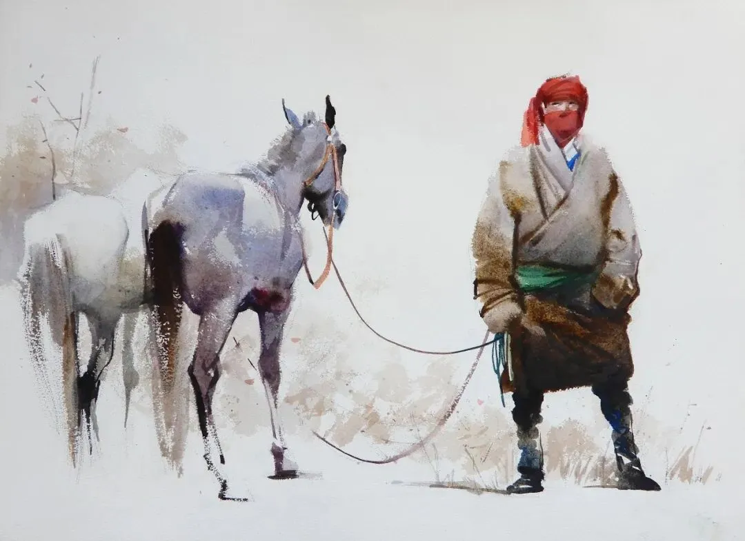 《藏人牧马图》水彩76x54cm