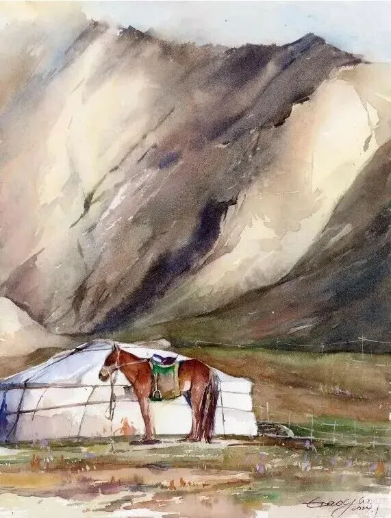 《哈萨克族的蒙古包》水彩39x27cm