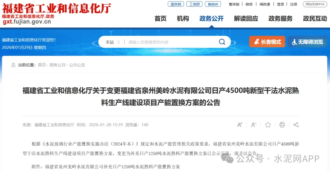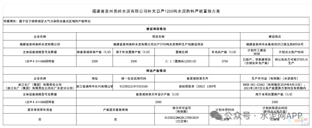 1月28日,福建省工信厅发布“关于变更福建省泉州美岭水泥有限公司日产4500吨新型干法水泥熟料生产线建设项目产能置换方案的公告”。据此前公示显示,福建省工业和信息化厅于2021年1月7日公告了福建省泉州美岭水泥有限公司日产4500吨新型干法水泥熟料生产线建设项目产能置换方案,该公告方案因故未按计划实施。现企业申请变更该公告。原用于置换新建产能变更为福建省泉州美岭水泥有限公司补充日产1250吨水泥熟料产能置换方案予以公示。