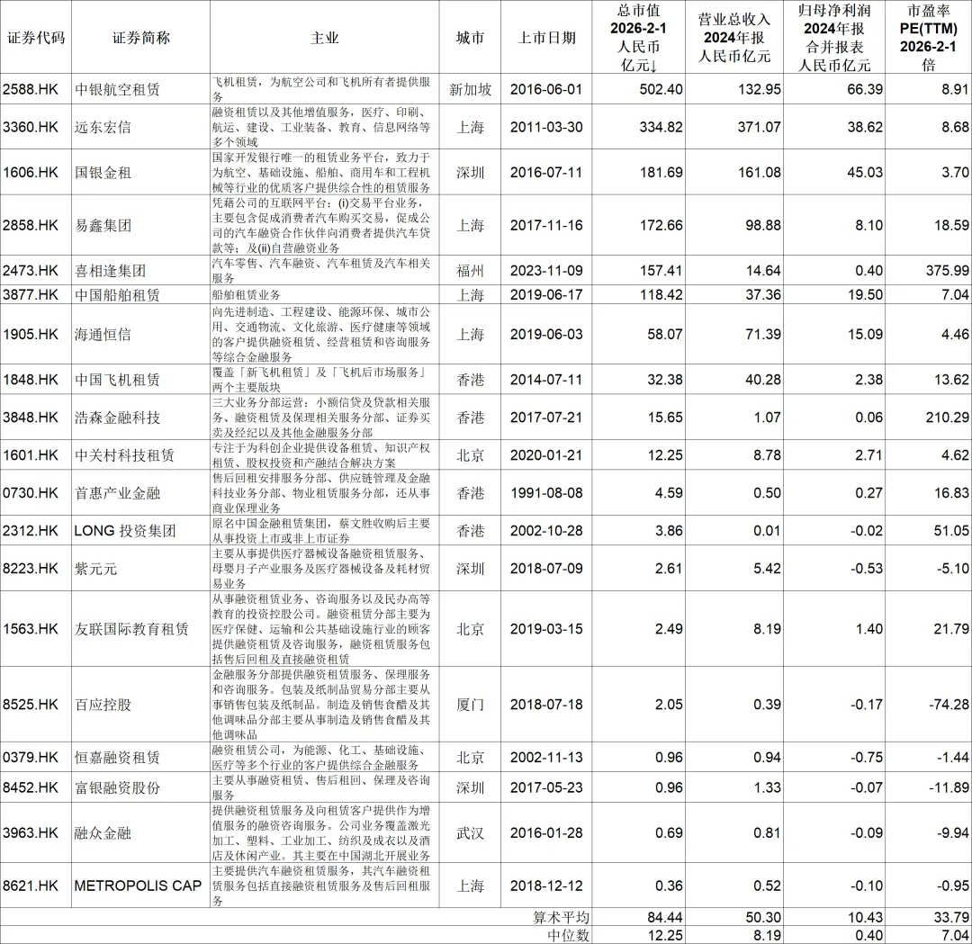 截至2026年1月,港股上市的融资租赁公司有近20家,市值超百亿的有中银航空租赁(2588.HK)、远东宏信(3360.HK)、国银金租(1606.HK)、易鑫集团(2858.HK)、喜相逢集团(2473.HK)、中国船舶租赁(3877.HK)这6家。