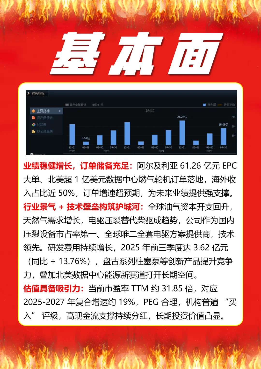 杰瑞股份(002353)是 1999 年成立、2010 年深交所上市的全球油气能源装备与技术服务商,总部位于山东烟台,实控人为刘贞峰等三位自然人,核心业务聚焦高端装备制造、油气工程与技术服务、新能源及环保领域,在压裂、固井等油气装备领域国内市占率领先,是唯一向北美高端市场提供全套压裂设备的中国企业,产品销往 70 多个国家和地区。公司近年发力天然气全产业链与新能源,2025 年前三季度营收 104.2 亿元(同比 + 29.49%)、归母净利润 18.08 亿元(同比 + 13.11%),经营性现金流同比大增 99.45%,海外收入与订单增长强劲,北美数据中心燃气轮机订单落地,叠加新能源布局,打开长期增长空间。