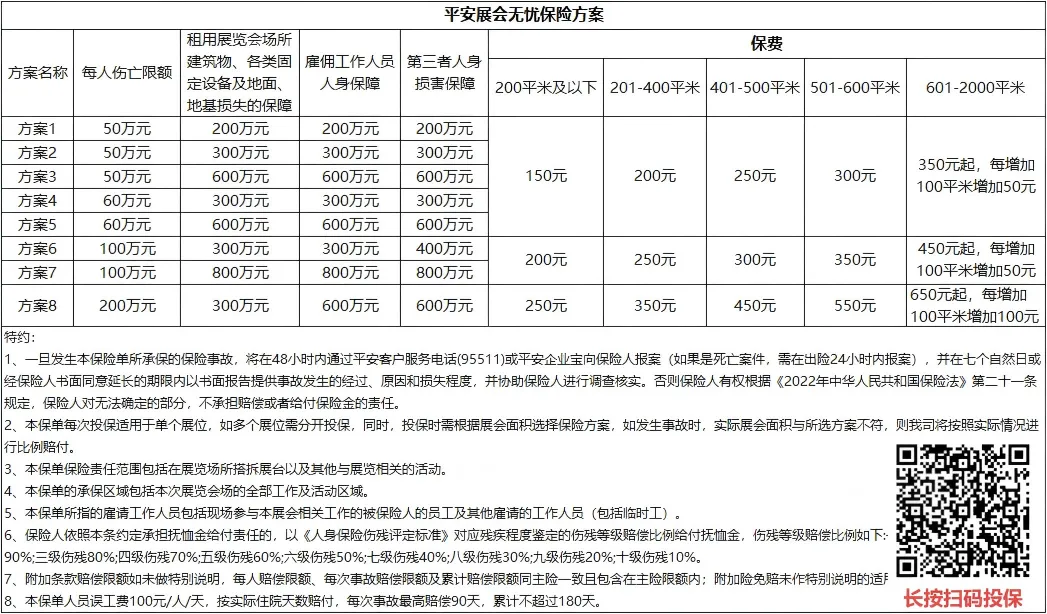 2、本保单每次投保适用于单个展位,如多个展位需分开投保,同时,投保时需根据展会面积选择保险方案,如发生事故时,实际展会面积与所选方案不符,则我司将按照文际情兄进行比例赔付。
