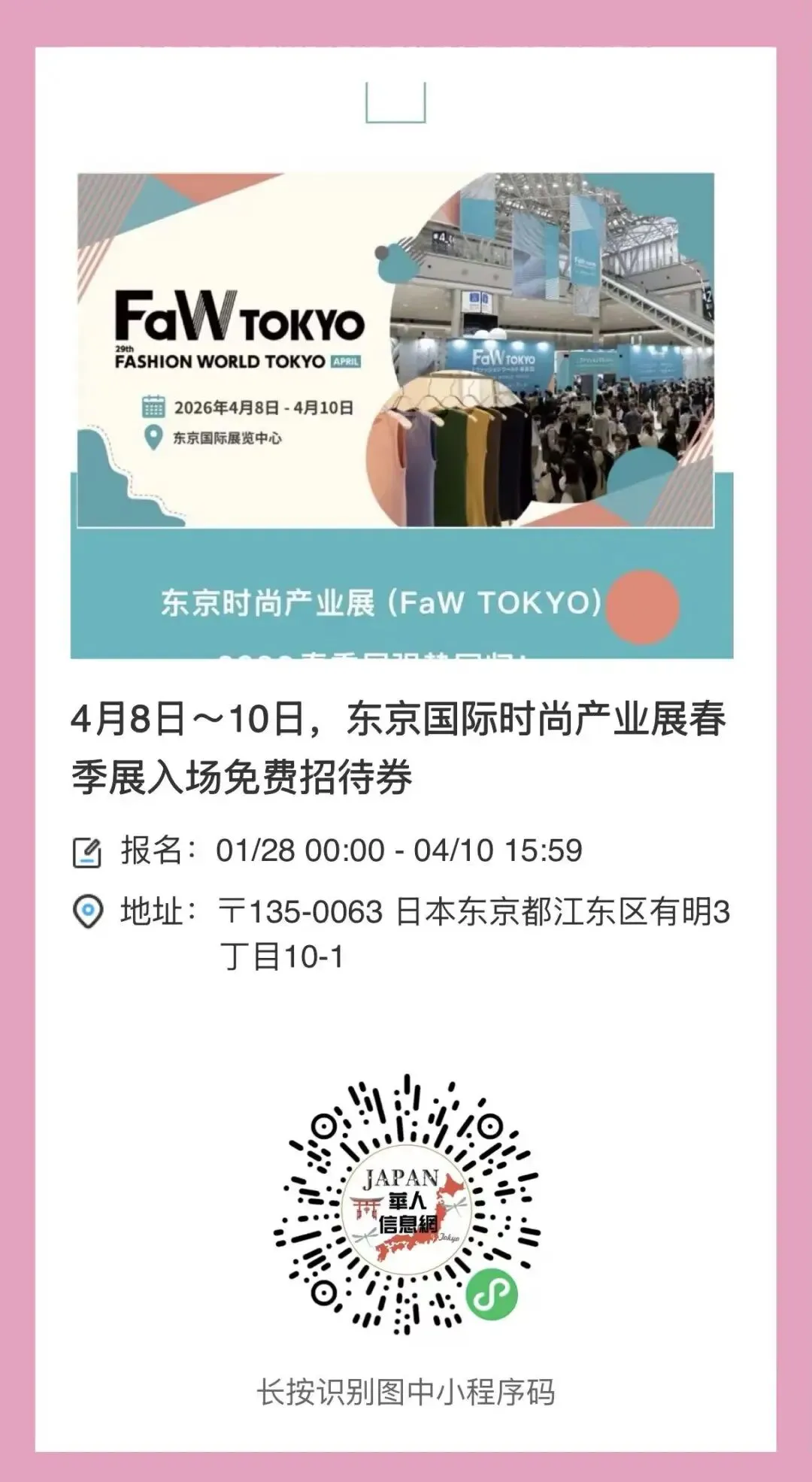 FaW TOKYO是日本规模最大的时尚产业BtoB贸易展。2026年春季展预计将汇集来自20个国家/地区的700家参展商,展会内容更多元,国际合作机会更丰富。