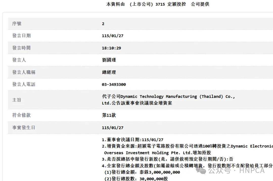 1月27日,台湾PCB大企定颖投控(3715.TW)发布公告称,为满足经营发展需要,公司旗下企业超颖电子(603175.SH)拟通过100%控股公司Dynamic Electronics Overseas Investment Holding Pte. Ltd.向泰国子公司Dynamic Technology Manufacturing (Thailand) Co., Ltd.现金增资30亿泰铢(约合6.74亿人民币)。