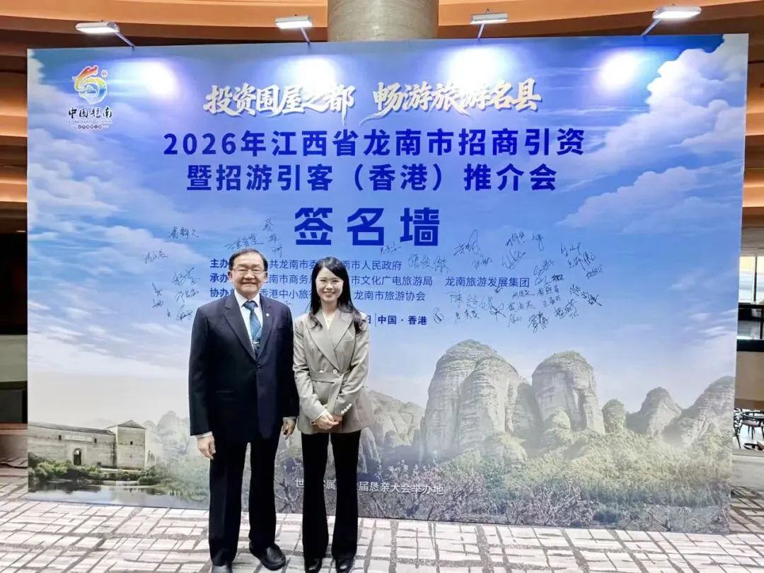 1月26日,“来龙南做客 入围又入阁” 2026年龙南市招商引资招游引客(香港)推介会在香港千禧新世界酒店盛大举行。环球集团董事长蔡维洲应邀出席,与来自政企学界的嘉宾共话合作机遇,在现场见证了招商引资招游引客合作签约仪式,以实际行动表达了对龙南发展前景的坚定信心。