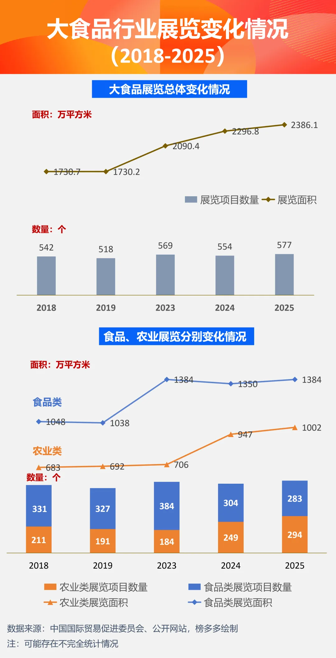 疫情防控政策优化后,大食品展会展览面积稳步回升,2025年再创新高,全年展览面积达2386.1万平方米;