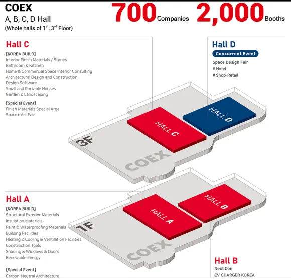 韩国建材展(KOREA BUILD)从1986年举办至今,是韩国规模最大、历史最悠久的建材展,也是韩国唯一获得 UFI认证的全球性建筑展览会。该展一年两届,分别在京畿道 KINTEX和首尔COEX举办。 韩国建材展被韩国工贸能源部认定为“大韩民国代表品牌展”,也被当地政府及其他相关产业任命为 MKE(知识经济部门)的代表。韩国建材展展示了韩国建筑产业的发展成就和趋势,被业界誉为行业发展风向标。韩国建材展涵盖了广泛的建筑领域,包括建筑材料、室内装饰、建筑技术、绿色建筑、智能建筑、建筑设备等。