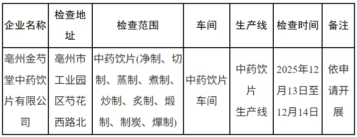 根据《中华人民共和国药品管理法》《药品生产监督管理办法》等有关规定,亳州金芍堂中药饮片有限公司申请在原址、就原生产范围中药饮片(净制、切制、蒸制、煮制、炒制、炙制、煅制、制炭、燀制)改建中药饮片车间中药饮片生产线合并中药饮片(净制、切制、蒸制、煮制、炒制、炙制、煅制、制炭、燀制)(中药饮片车间中药饮片生产线)上市前药品GMP符合性检查,我局于2025年12月13日至12月14日依申请对亳州金芍堂中药饮片有限公司开展了药品GMP符合性检查。经现场检查并综合评定,本次依申请开展的药品GMP符合性检查结论为符合要求,现予以公告。
