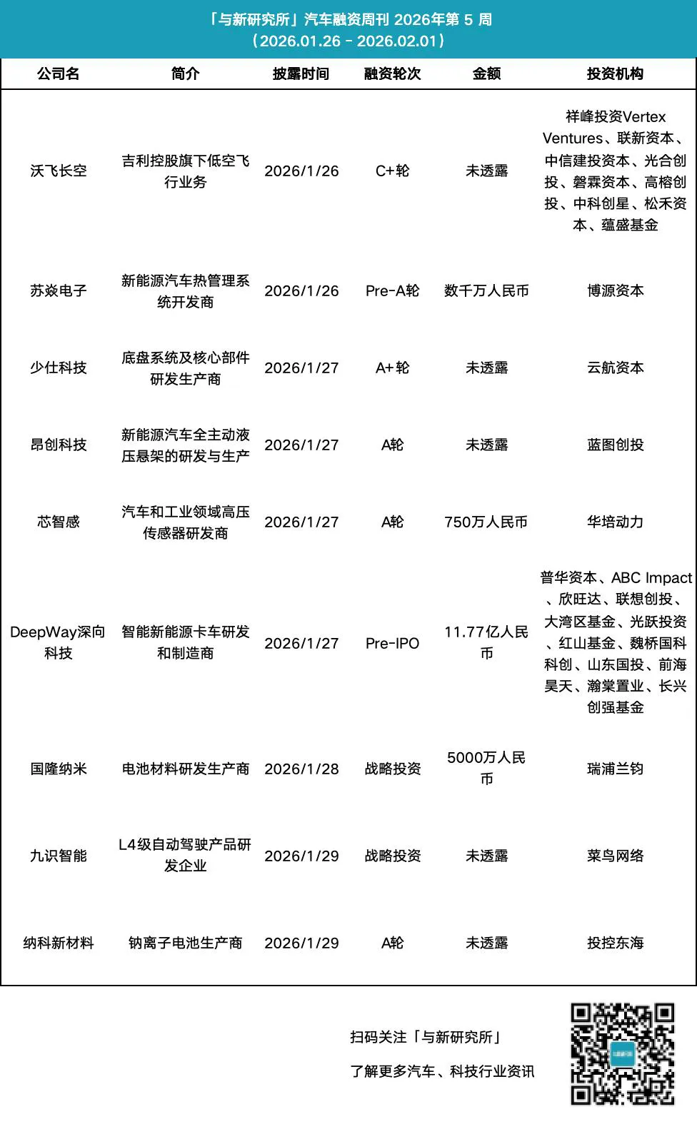2026年1月26日- 2月1日,「汽车」产业链发生融资事件 9 起。「沃飞长空」完成C+轮融资,由祥峰投资Vertex Ventures、联新资本领投成立于2020年,是吉利科技集团旗下的低空出行品牌,国内eVTOL领域的领跑者。核心产品为AE200型载人飞行器,采用倾转旋翼构型,致力于解决城市群内的空中交通拥堵问题。公司深度复用了吉利在汽车供应链、适航认证及生产制造上的积累,是国内适航取证进度最快的企业之一。本轮融资将用于全尺寸验证机的试飞及商业化运营的筹备,推动低空经济从概念走向现实。