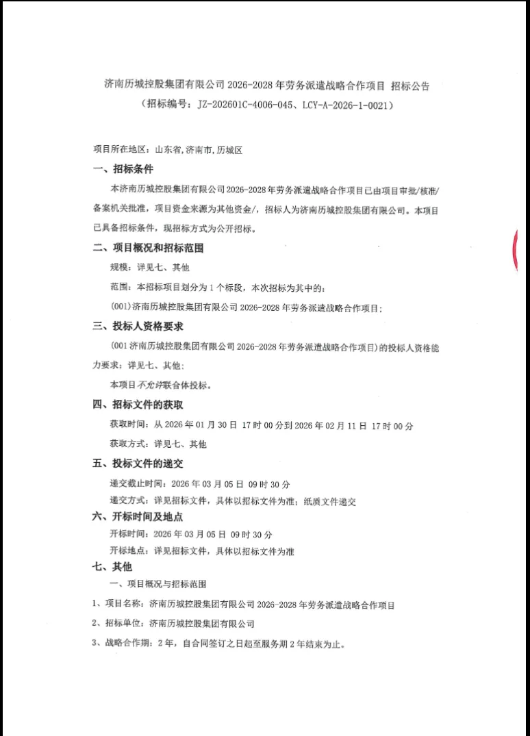 济南历城控股集团有限公司2026-2028年劳务派遣战略合作项目招标公告(招标编号:JZ-202601C-4006-045、LCY-A-2026-1-0021)