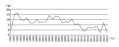 近年来,我国啤酒产业蓬勃发展,啤酒制造技术趋于成熟,目前已成为全球第一大啤酒生产国。但受制于啤酒消费需求边际放缓,我国啤酒产量见顶,啤酒产业的竞争格局也由早期“百花齐放”发展到当今的“几家独秀”。”下图适宜1992年-2022年我国啤酒产量同比增长率,据此完成3-5题。