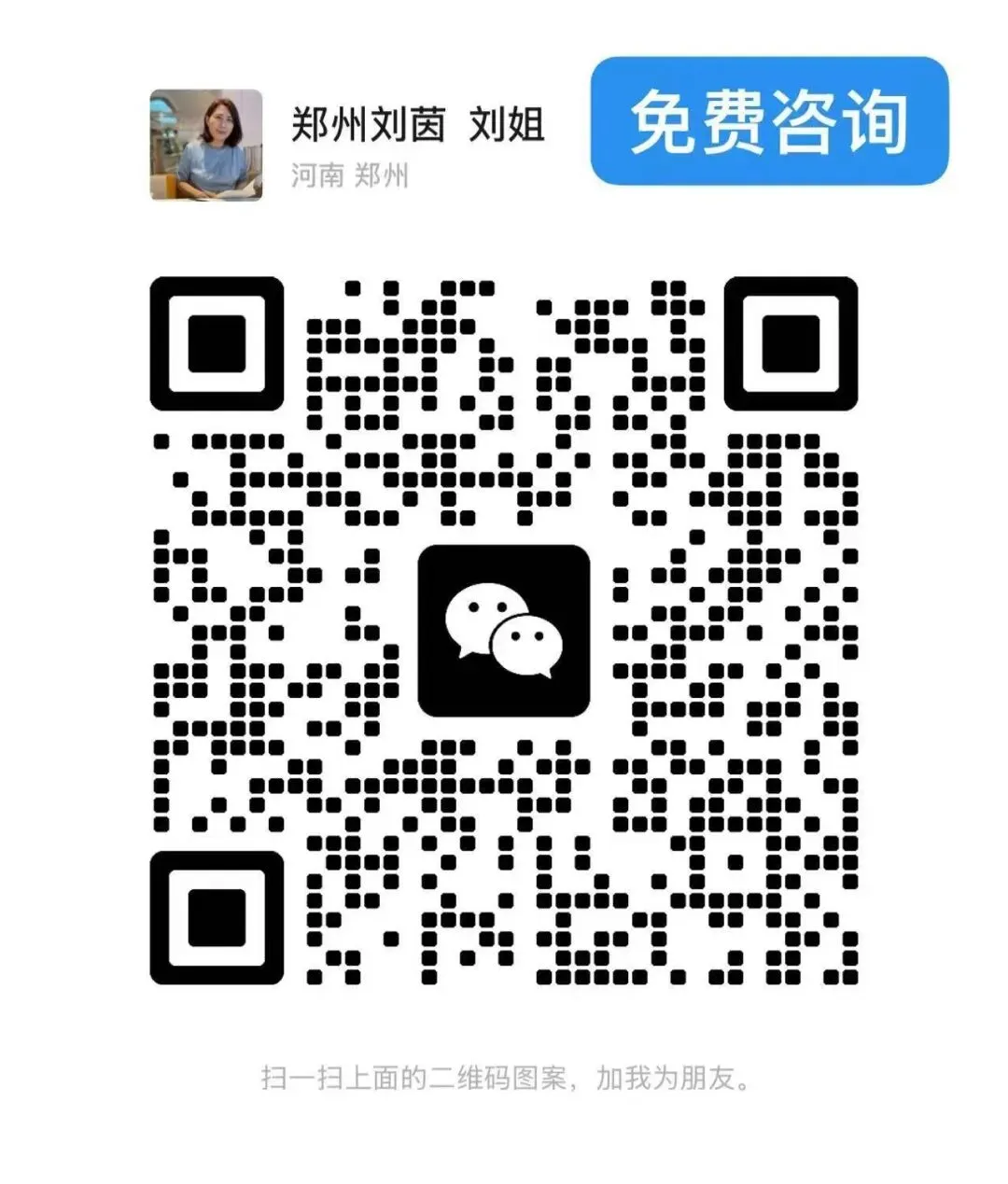 最后,我是郑州刘茵,大家都叫我刘姐。坐标河南郑州,服务全国,11年专注个人房产抵押贷、公积金信用贷、商户贷、企业税票贷、科技贷、土地厂房大额抵押贷等业务;关注我,让您在融资路上少走弯路,少踩坑、不迷路!vxL18638612148,也可以扫下面二维码添加微信。