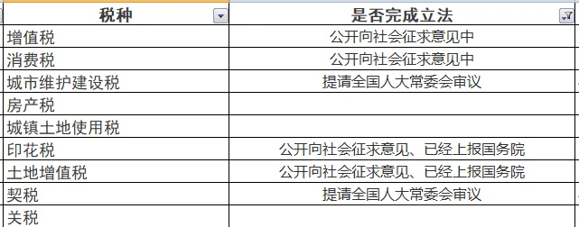 虽然有18个税种,但是目前通过人大立法的只有9个,分别是个人所得税、企业所得税、车船税、环保税、烟叶税 、船舶吨税 、车辆购置税和耕地占用税、资源税。