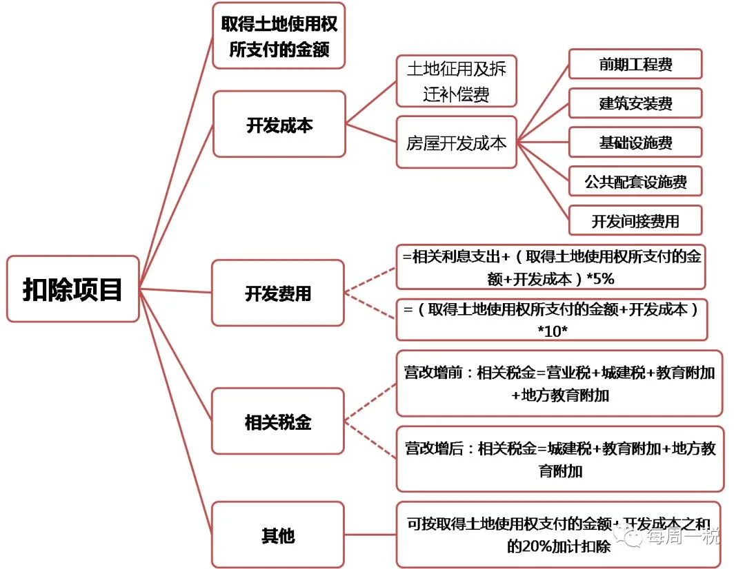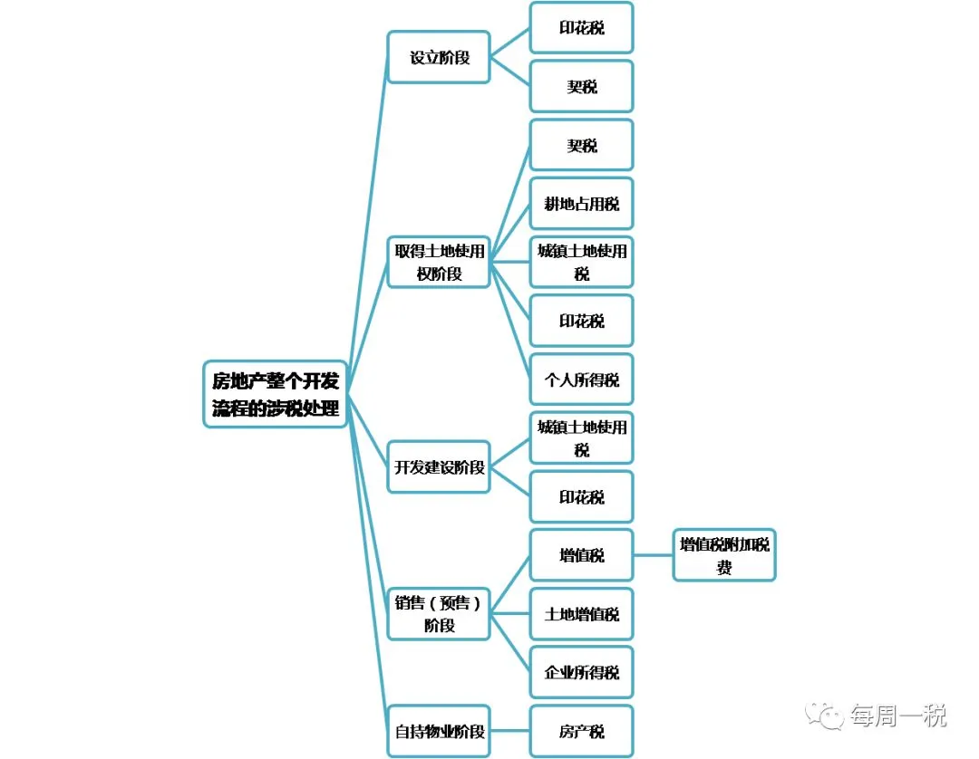 一般情况下,增值税、城市维护建设税、个人所得税、企业所得税、印花税是标配,大部分企业都会涉及。房产税、城镇土地使用税、资源税、土地增值税、车船税、烟叶税、契税、耕地占用税、环境保护税这类财产行为税种,是你有这类财产或者发生这类行为才会涉及。关税只有涉及进口的行业才会涉及,船舶吨税也仅仅是中华人民共和国境外港口进入境内港口的船舶缴纳。如果要说哪个行业涉及税种最多,那么房地产业应该是涉及最多的行业。首先让我们有一个关于房地产整个开发流程的涉税框架图,然后再一一细说每一个税种。1.企业设立阶段,企业需建立会计账簿,根据目前最新的印花税规定,自2018年5月1日起,对按万分之五税率贴花的资金账簿减半征收印花税,对按件贴花五元的其他账簿免征印花税;2.企业拿地阶段,须签订土地使用权出让或转让合同,税率为0.05%;3.企业开发建设阶段,需要签订各类合同,如建筑安装工程承包合同、货物运输合同、建筑工程勘察设计合同等,不同合同对应的印花税税率不同;4.值得一提的是,这里有个可以省税的办法,根据《中华人民共和国印花税暂行条例》的规定,购销合同的计税依据为合同上载明的“购销金额”:如果购销合同中只有不含税金额,以不含税金额作为印花税的计税依据;如果购销合同中既有不含税金额又有增值税金额,且分别记载的,以不含税金额作为印花税的计税依据;如果购销合同所载金额中包含增值税金额,但未分别记载的,以合同所载金额(即含税金额)作为印花税的计税依据。因此合同中订立的不含税价格可以少缴纳税款部分的印花税。2.在企业设立阶段,若接受出资人以土地使用权出资,则获得投资的一方需要缴纳契税;3.在企业拿地之后,企业应缴纳的契税=土地出让价款*适用税率(一般适用税率为3%-5%)。土地出让价款包括土地出让金、土地补偿费、安置补助费、地上附着物和青苗补偿费、拆迁补偿费、市政建设配套费。4.值得一提的是,市政建设配套费若在《土地出让合同》明确列明具体价格时,可以作为契税缴纳依据。若《土地出让合同》未列明,则不应当作为契税缴纳依据,在实务过程中,须充分与主管税务机关进行沟通确认,进行合同条款设计。1.纳税义务人:占用耕地建房或者从事其他非农业建设的单位和个人;2.计算公式:耕地占用税=占用的耕地面积*定额税率。1.纳税义务人:在城市、县城、建制镇、工矿区范围内使用土地的单位和个人;2.计算公式:城镇土地使用税=实际占用的土地面积*定额税率;3.值得一提的是,城镇土地使用税的纳税义务发生时间为《土地出让合同》中约定的交付土地时间,若未约定,则从签订合同次月算起。在实务中,开发商先占有土地进行前期开发,是具有节税效果的~4.房地产开发企业城镇土地使用税纳税义务截止时间为商品房出售双方签订销售合同生效的当月末,按房屋销售相应比例核减应税土地面积,按月计算城镇土地使用税,分上下半年缴纳。这个比较简单,按照规定,就是在企业取得土地使用权阶段,若房开对拆迁的居民没有超过当地政府规定的补偿标准,则对被拆迁人取得的迁拆补偿,免征个人所得税,若超出了标准,则房开应代扣代缴其应纳的个人所得税。增值税应纳税额=销项税额-进项税额=(全部价款和价外费用-当期允许扣除的土地价款)/(1+9%)*9%-企业当期进项税额在企业预售阶段,房开采取预收款方式销售不动产,在收到预收款时按照3%的预征率预缴增值税。预缴税额=预收款/(1+适用税率或征收率)*3%,适用一般计税方式的话,适用税率为9%,适用简易计税方法的,按5%的征收率。3.值得一提的是,2016年5月1日起,房地产行业进行了营改增,即2016年5月1日起,销售房子需要缴纳增值税,而不再是营业税。在《营改增暂行办法》中规定,一般纳税人销售自行开发的房地产老项目,可以选择适用简易计税办法按照5%的征收率计税。(1)《建筑工程施工许可证》注明的合同开工日期在2016年4月30日前的建筑工程项目。(2)未取得《建筑工程施工许可证》的,建筑工程承包合同注明的开工日期在2016年4 月30日前的建筑工程项目。5.不同纳税人开发老项目与新项目缴纳增值税的情况汇总如下:增值税附加税费是增值税的影子,包括城建税、教育费附加以及地方教育费附加,比较容易理解,其计税公式=增值税税额*(7%+3%+2%)。1.作为房地产缴税的大头,土增税的计税依据是以转让房地产取得的收入,减除法定扣除项目金额后的增值额。应纳税额=土地增值额*适用税率-扣除项目金额*速算扣除系数=(应税收入-扣除项目金额)*适用税率-扣除项目金额*速算扣除系数其中,土地增值额=转让房地产取得的收入-扣除项目金额,3.值得一提的是,由于在房地产项目开发周期长,在还没有正确计算出房地产项目增值率的情况下,为确保税款平稳,均匀的流入国库,房地产采取先预征后清算的征管模式。土增税应预缴税款=(预收款-应预缴增值税税款)×预征率(2)对房地产开发企业开发的普通住宅,按1%预征土地增值税;(3)对房地产开发企业开发的非普通住宅,按3%预征土地增值税;(4)对房地产开发企业开发的商铺及其他房产,按4%预征土地增值税。,明确免征增值税、土地增值税办理条件。因为涉及收入、成本和费用的确认,企业所得税是所有税收种类中的最难理解和申报的。本文也只能抛砖引玉,简单介绍涉及收入的