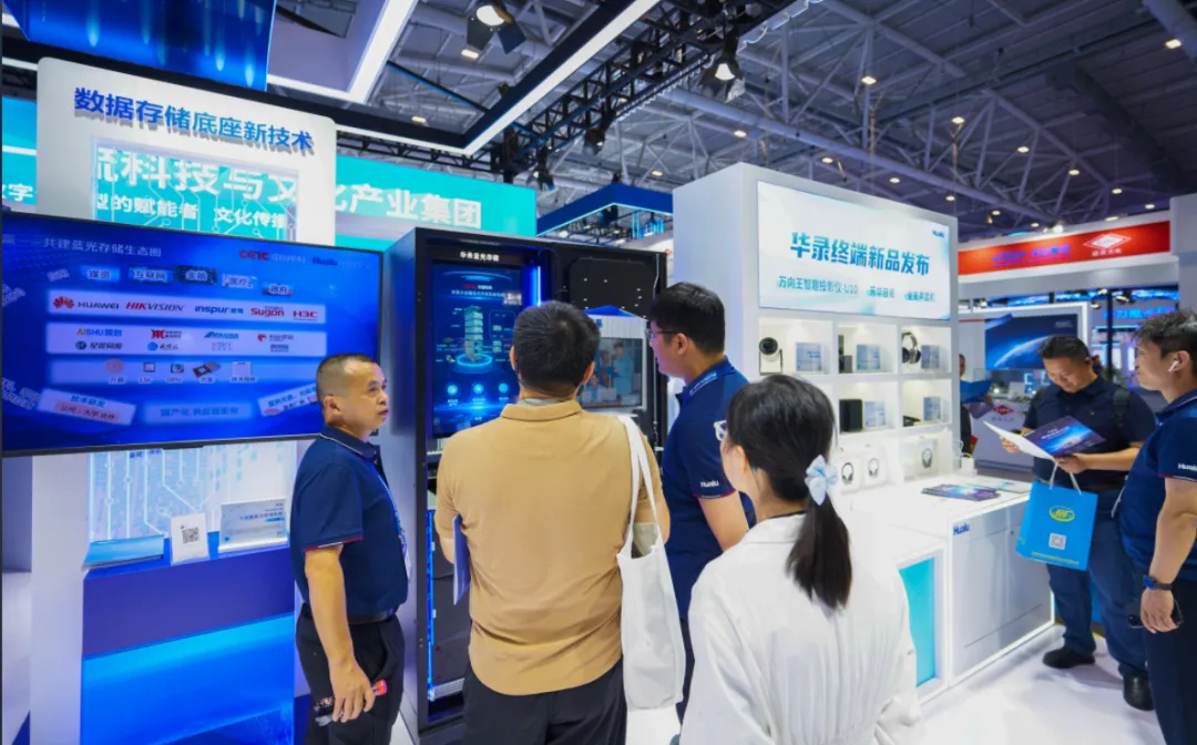 在数字底座新技术展区,全新亮相的大容量蓝光存储系统,凭借自主可控核心技术优势,同时搭载科技感外观设计,吸引众多专业观众驻足交流。该产品已广泛应用在数据中心、金融、互联网、广电、档案、公检法、医疗等行业。