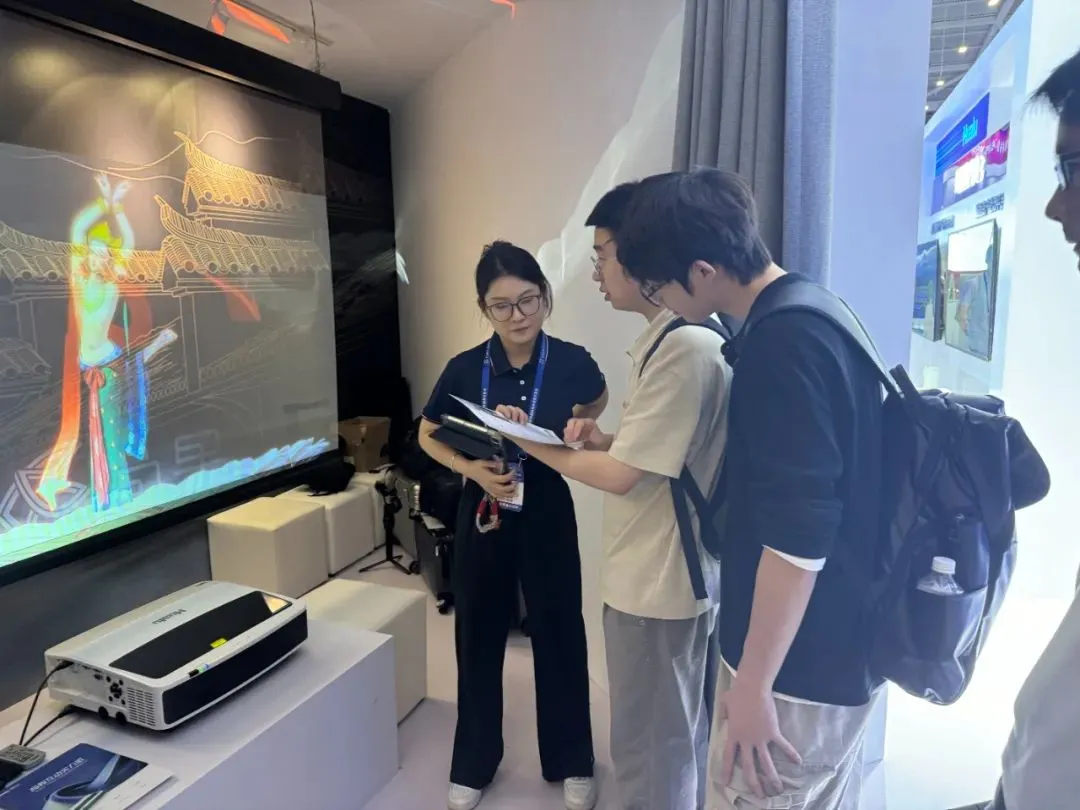 在数字文旅应用场景互动区展示的数字博物馆投影解决方案,通过采用全息技术将文物动态影像与虚拟现实场景完美融合,在科技赋能之下,千年文物有了“新生命”,吸引众多观众交流互动。
