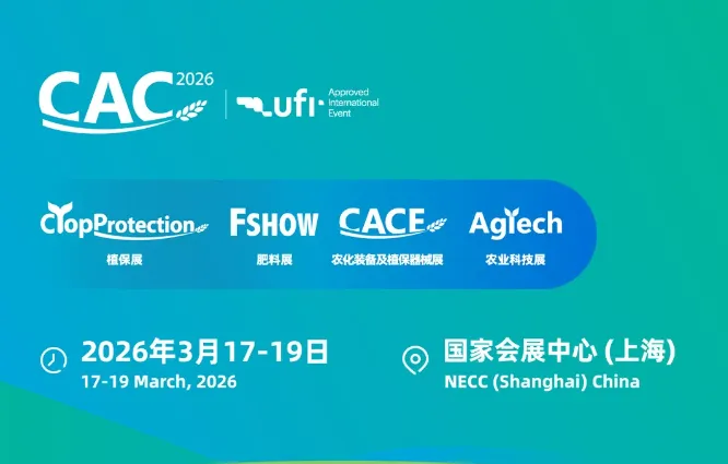 第二十六届中国国际农用化学品及植保展览会(CAC2026)将在国家会展中心(上海)1.2馆、2.2馆、5.2馆、6.2馆、7.2馆、8.2馆举办,展出面积达到16万平方米,将吸引超过2200家企业齐聚上海!