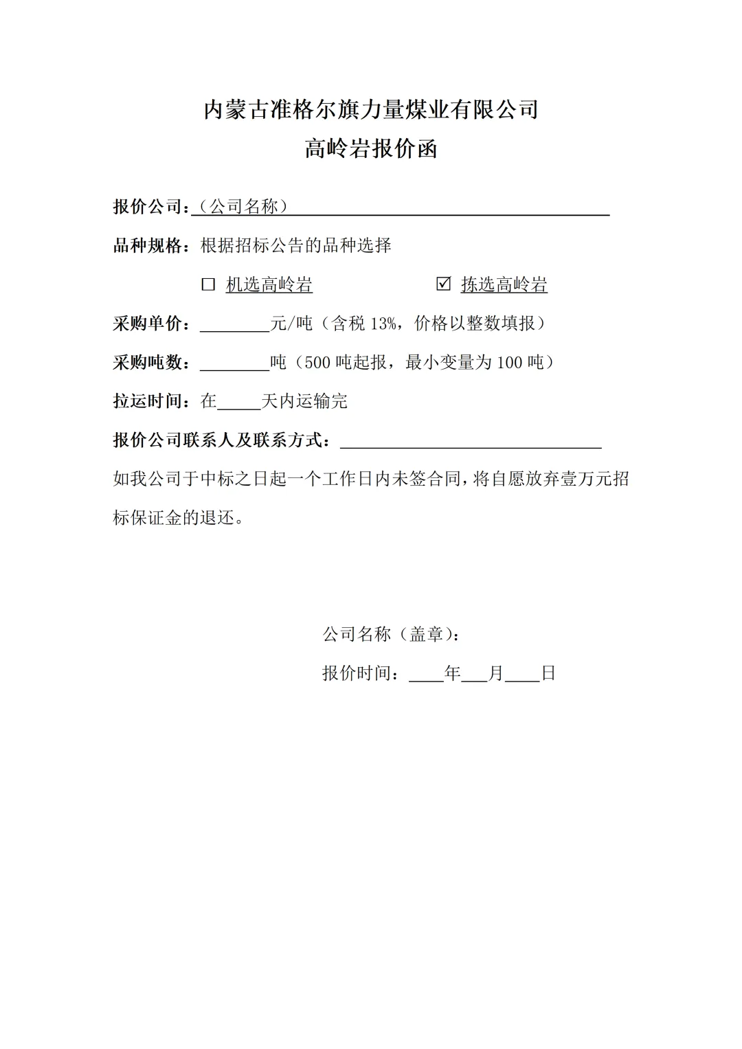 客户以委托方规定的《高岭岩报价函》格式(下附《高岭岩报价函》模板)进行报价,盖上公章,并将报价结果在规定的报价时间内发送至邮箱:lilianggaolingyan@kineticme.com.cn。