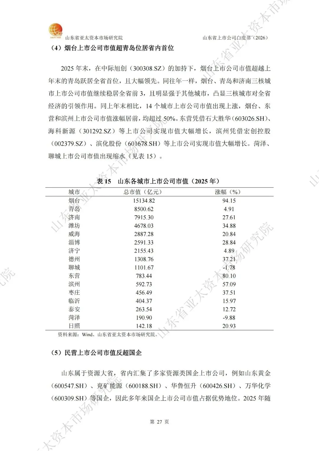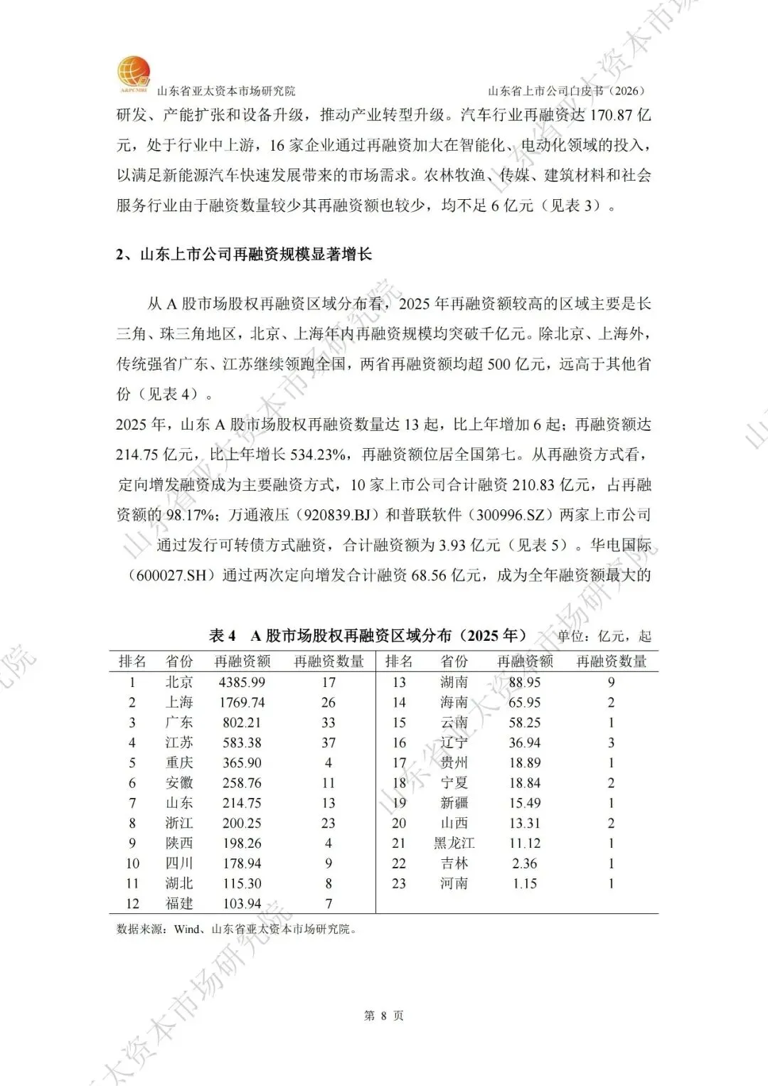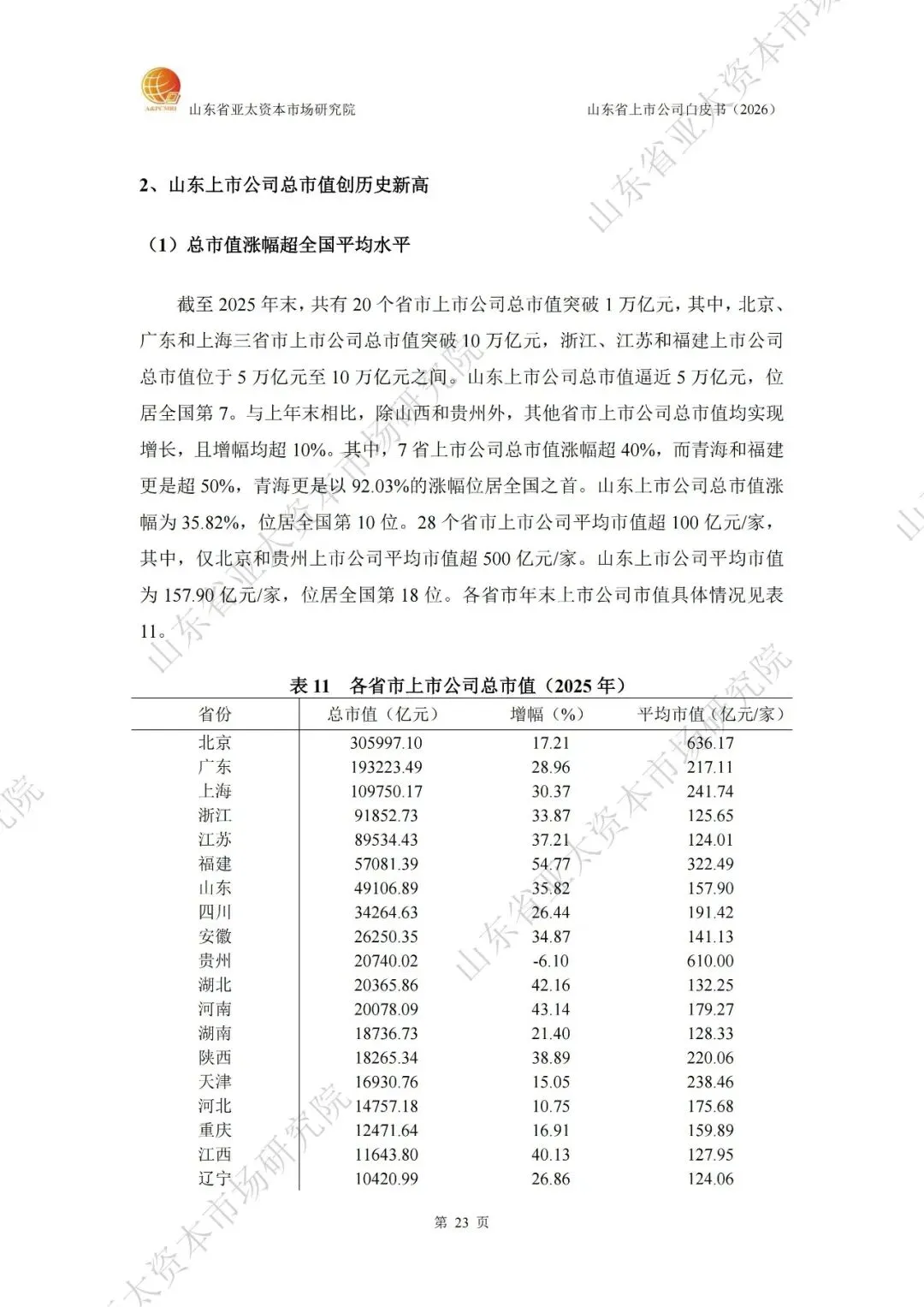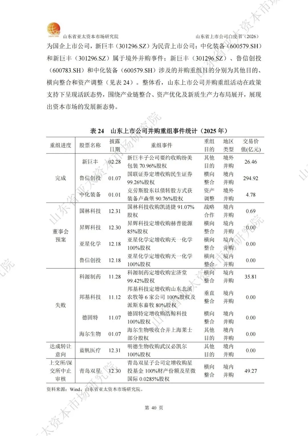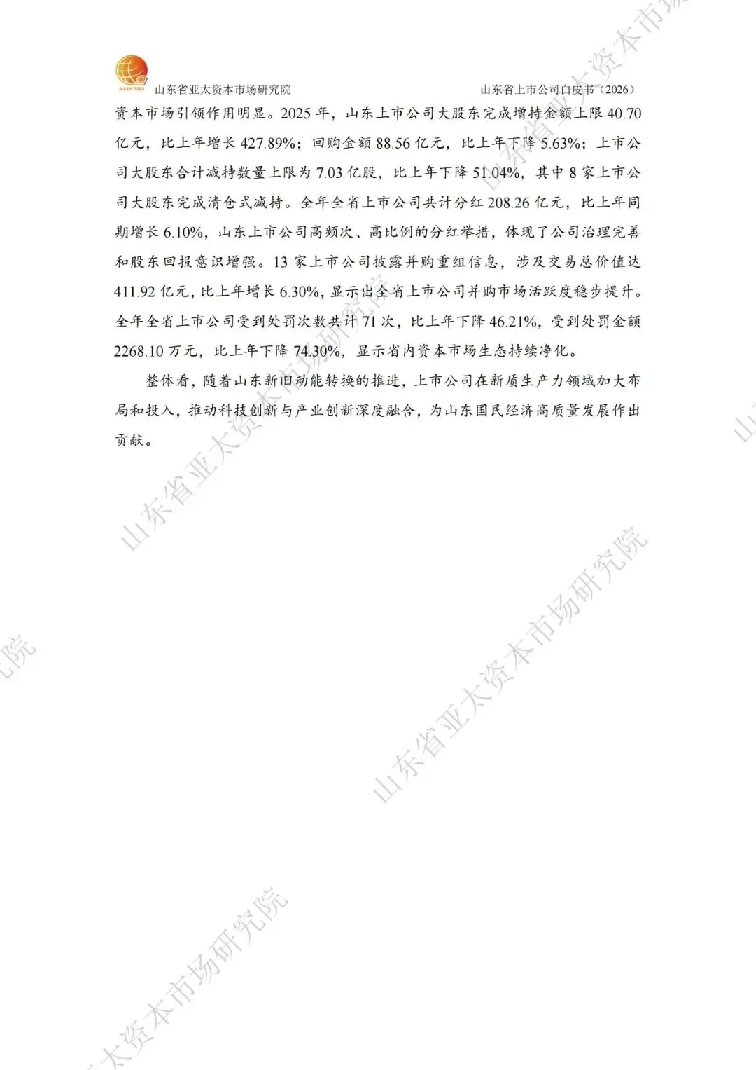 2025年是“十四五”规划收官之年。我国资本市场在服务实体经济、深化改革创新和培育新质生产力方面取得显著成效,直接融资规模扩大、长期资金加速入市、科技金融体系不断完善,整体呈现高质量发展态势。山东资本市场表现精彩纷呈,山东板块指数增幅居全国第3,单家上市公司市值首次突破5000亿元,代表新质生产力发展方向的通信行业市值首次超越传统行业市值,上市公司全年分红超200亿元,体现了公司治理结构的完善与股东回报意识的强化,上市公司并购重组金额比上年增长6.30%,显示出全省上市公司并购市场活跃度稳步提升。整体看,山东上市公司在政策支持下呈现活跃态势,围绕产业链整合、资产优化及新质生产力布局展开,展现出资本市场的发展新态势。