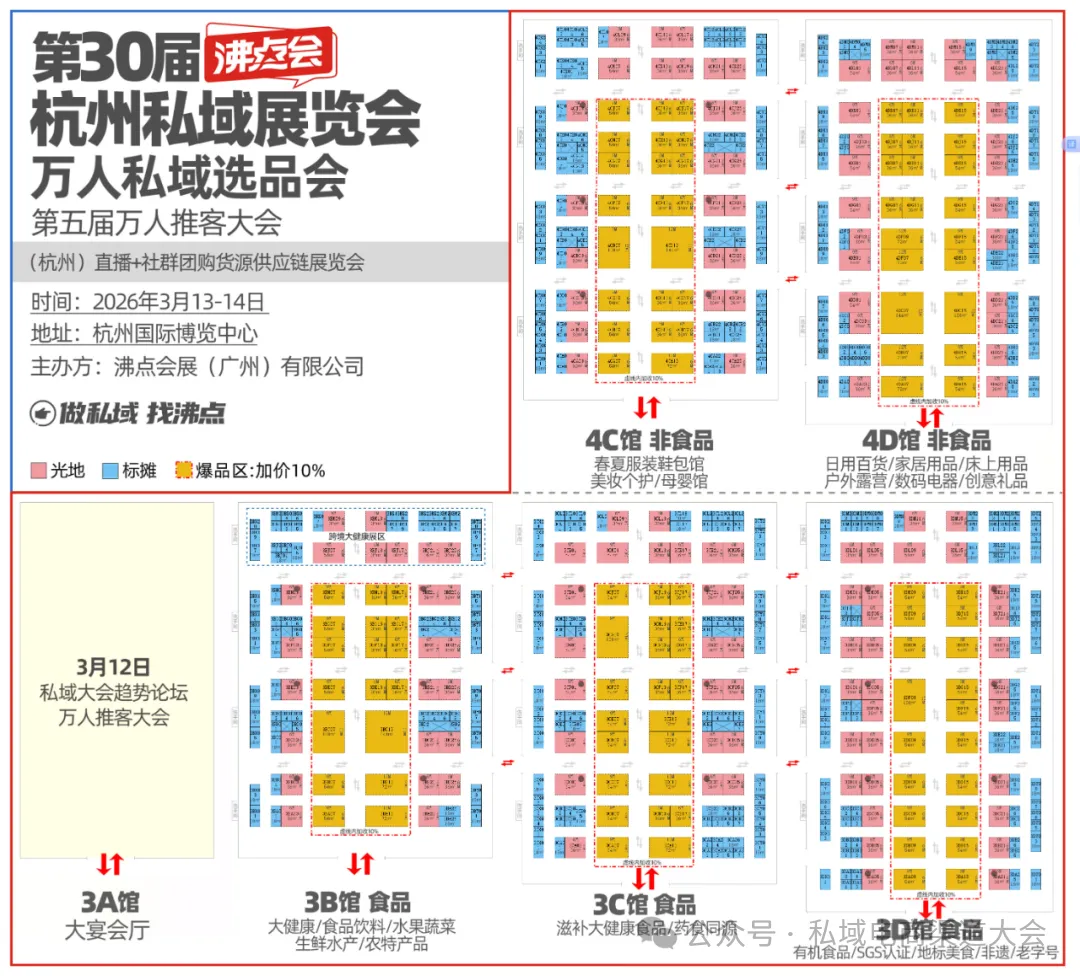 第30届沸点会暨杭州私域爆品展,将于2026年3月13-14日,在杭州国际博览中心举办。作为私域行业的“开年第一展”,本次大会将汇聚1000+优质展商、10000+新品爆品,98%私域头部渠道开年选品的第一站。展馆布局