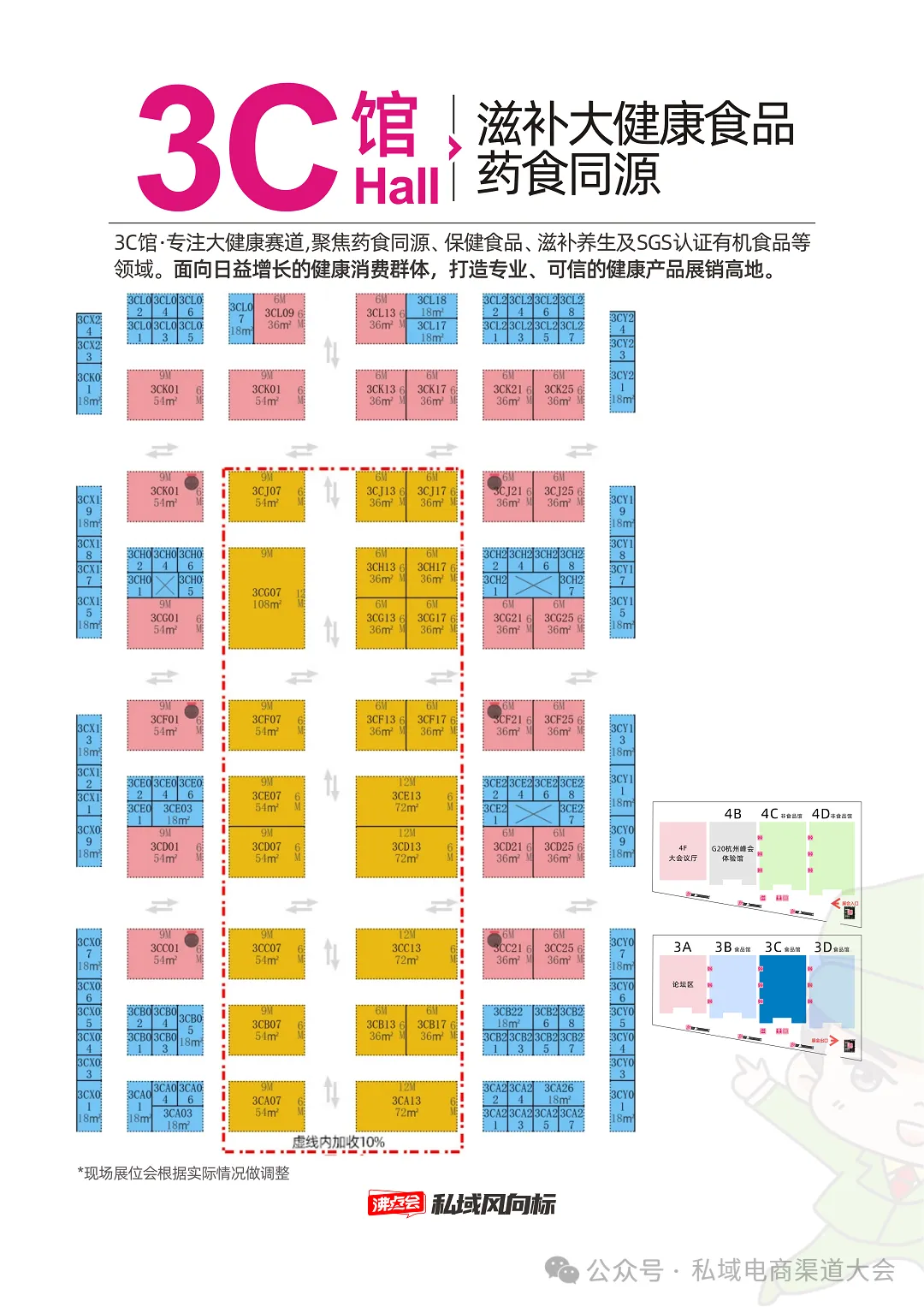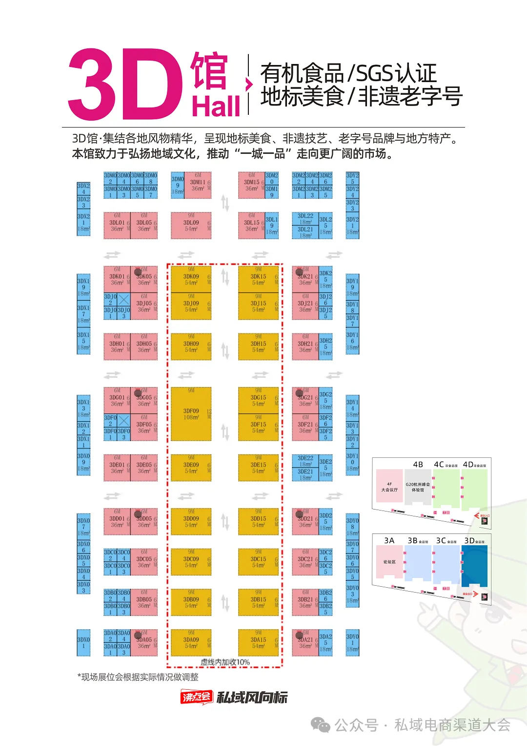 3B馆丨品类包含:大健康、食品饮料、水果蔬菜、生鲜水产、农特产品;3D馆丨品类包含:有机食品、SGS认证、地标美食、非遗老字号;4楼非食品展区