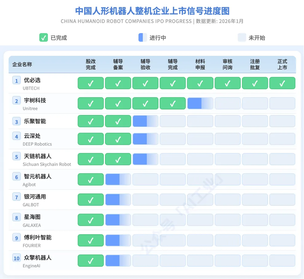 宇树科技(Unitree)目前尚未上市,但其 IPO 进度在本体公司中相对靠前,已到辅导完成阶段,属于“上市信号”较强的一档。