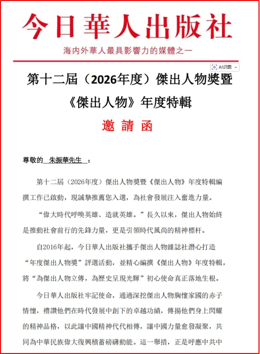 近日,第十二届(2026年度)杰出人物奖暨《杰出人物》年度特辑编撰工作正式启动,会展无忧安全顾问朱振华先生入选“年度杰出人物奖”评选活动。该奖项由2016年今日华人出版社携手杰出人物杂志社潜心打造,表彰各领域精英,弘扬家国情怀与奋斗精神,凝聚社会正能量。