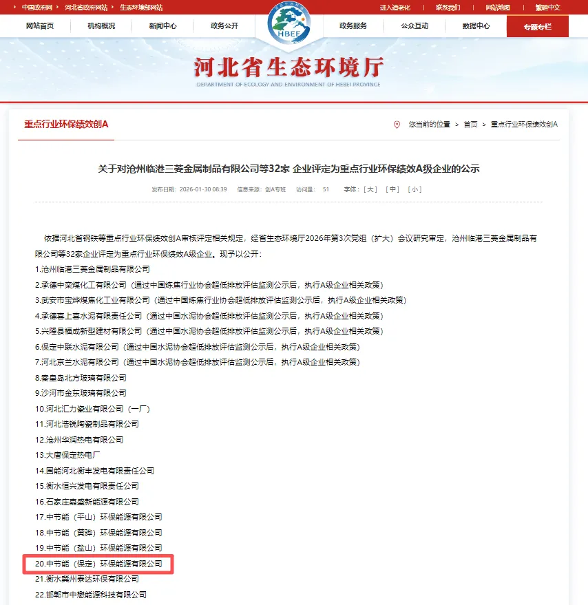 2026年1月30日,河北省生态环境厅发布《关于对 32 家企业评定为重点行业环保绩效 A 级企业的公示》,保定公司凭借在环保治理、精细化管理、绿色低碳运营等方面的突出表现,成功获评河北省重点行业环保绩效 A 级企业,成为保定市垃圾焚烧发电行业环保标杆企业。