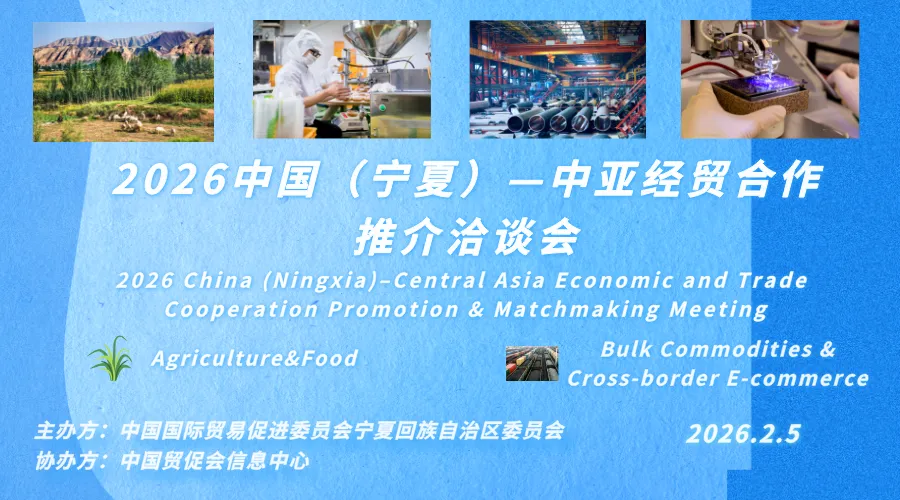 为推动国内企业“走出去”开拓新市场,打造中亚地区国际贸易合作重要平台,中国国际贸易促进委员会宁夏回族自治区委员会与中国贸促会信息中心将于2026年2月5日举办“2026中国(宁夏)—中亚地区经贸合作推介洽谈会”。本次会议将以线上形式举行,拟邀请有限数量企业及商协会重点推介其核心业务或产品。参会者将有机会与来自中国、中亚五国、蒙古和俄罗斯的商协会,以及特色农产品、食品、畜牧业、大宗商品和跨境电商等领域的外方头部企业进行实时交流。特此诚邀相关行业企业积极报名参会,共同合作,创造并把握宝贵商机!