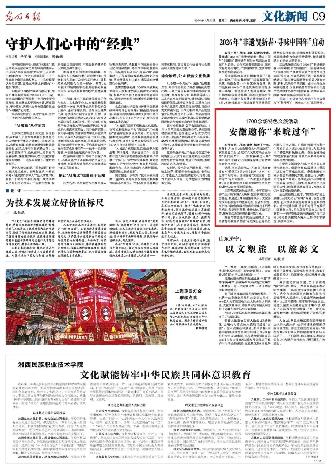 1月27日,光明日报9版报道《安徽邀你“来皖过年”》