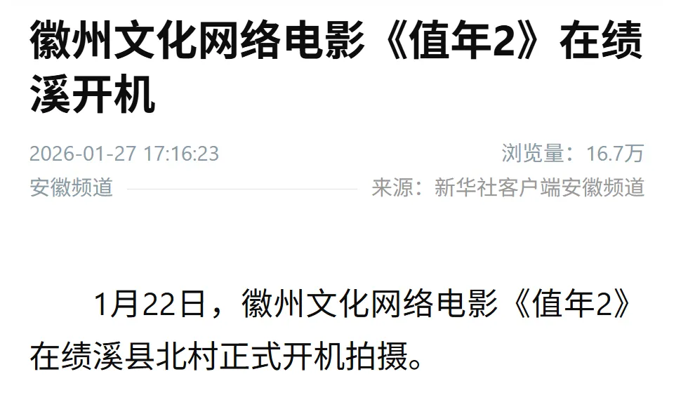 1月27日,新华社客户端推出报道《徽州文化网络电影《值年2》在绩溪开机》