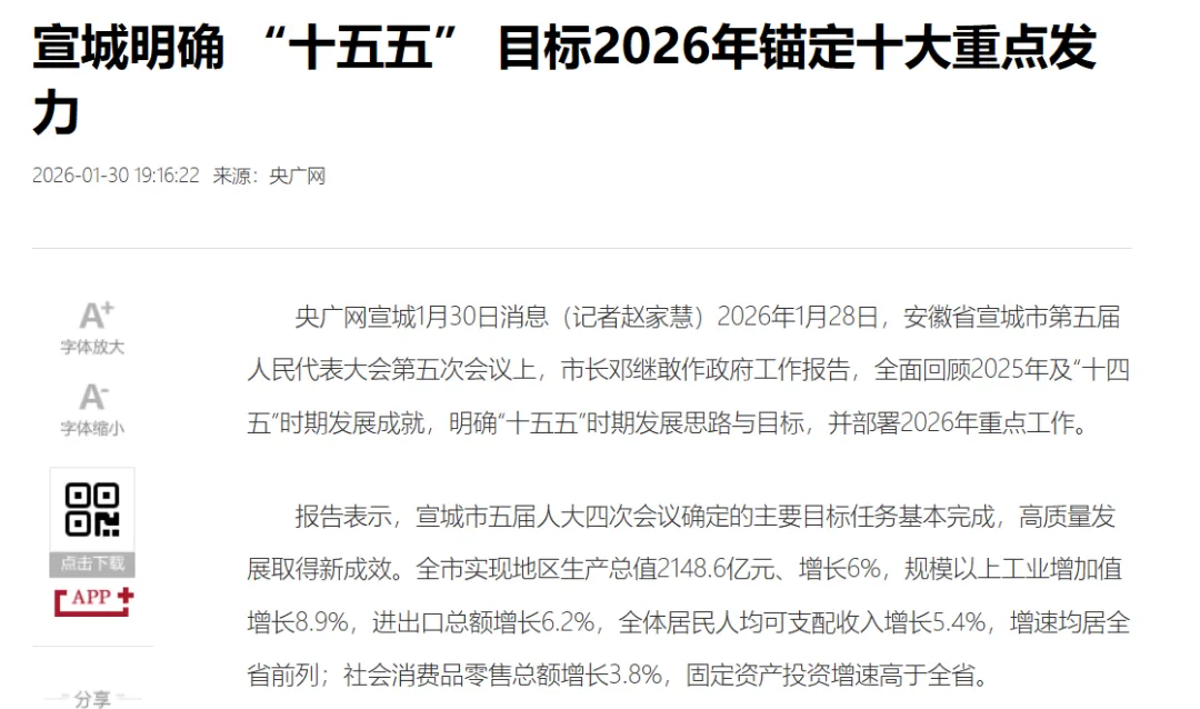 1月30日,央广网推出报道《宣城明确 “十五五” 目标2026年锚定十大重点发力》(点击下图可跳转阅读)